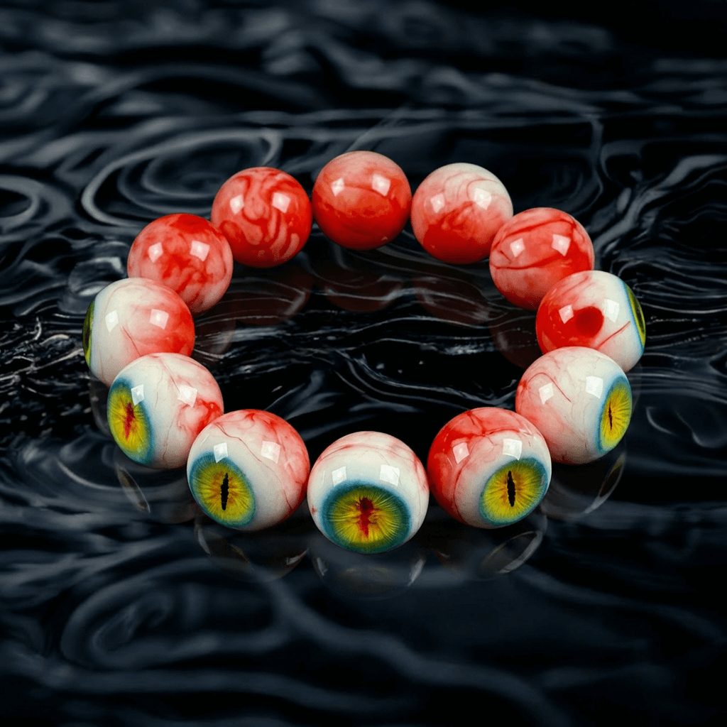 Featuring bloodshot eye beads with dual-tone teal and gold irises and fierce beast pupils. Each bead is embedded with glow-in-the-dark pigments and strung on a high-stretch, water-resistant elastic cord.