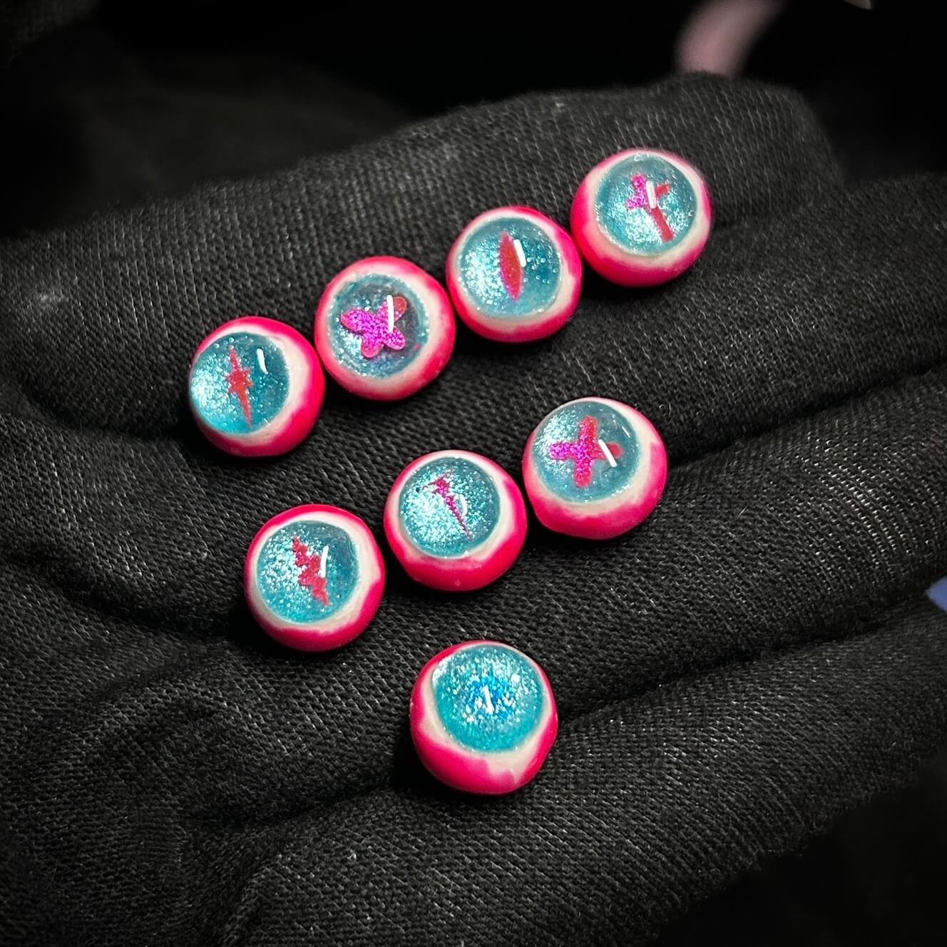 Pink scleras, blue irises with cat-eye glitter, and pink pupils in various fun shapes, including crosses, butterflies, and beast eyes. These designs capture both innocence and a touch of danger.
