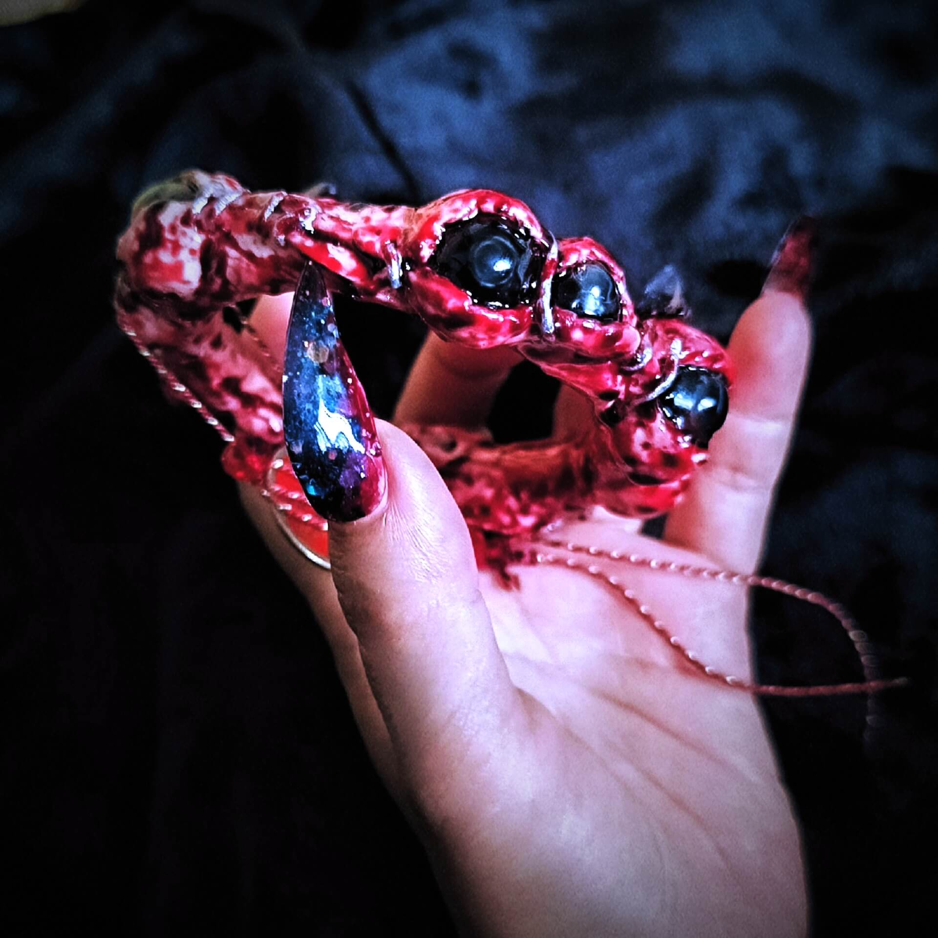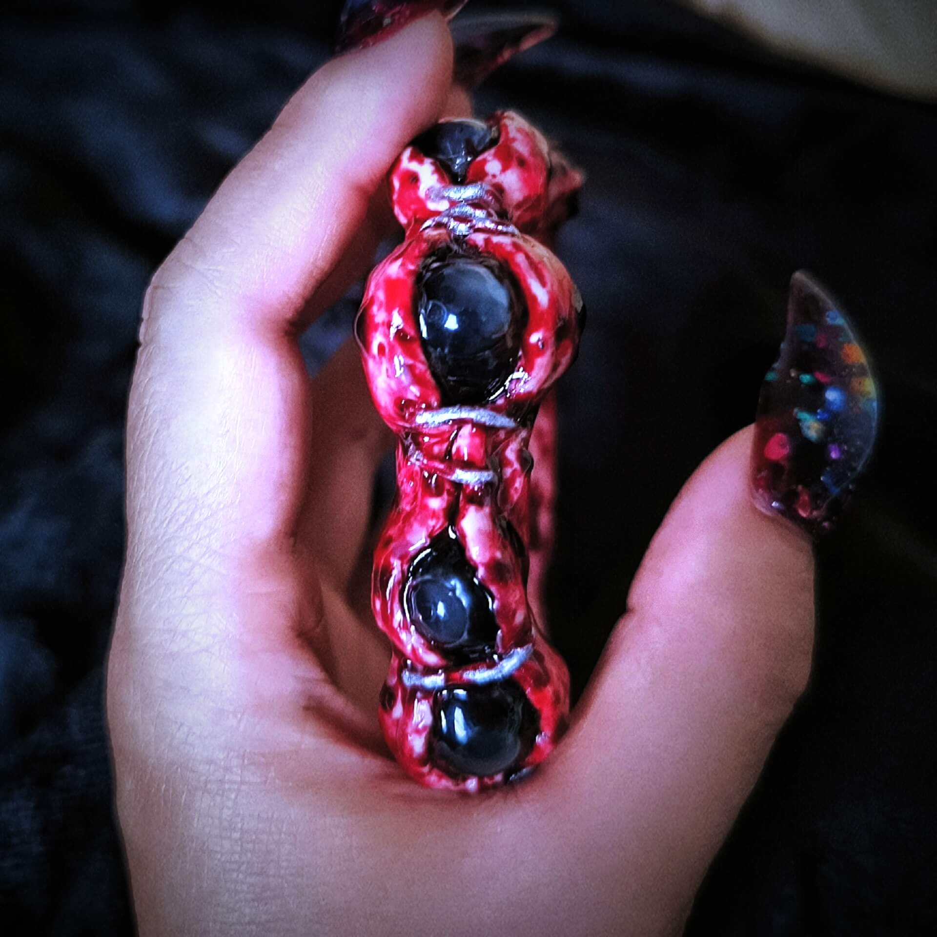 The BLOODBOUND bracelet is handcrafted from eco-friendly resin and soft polymer clay, blending unique artistry with durable materials. The design features bloodied, stitched flesh wrapping around a bold, all-black eyeball, making this piece a striking, one-of-a-kind accessory.