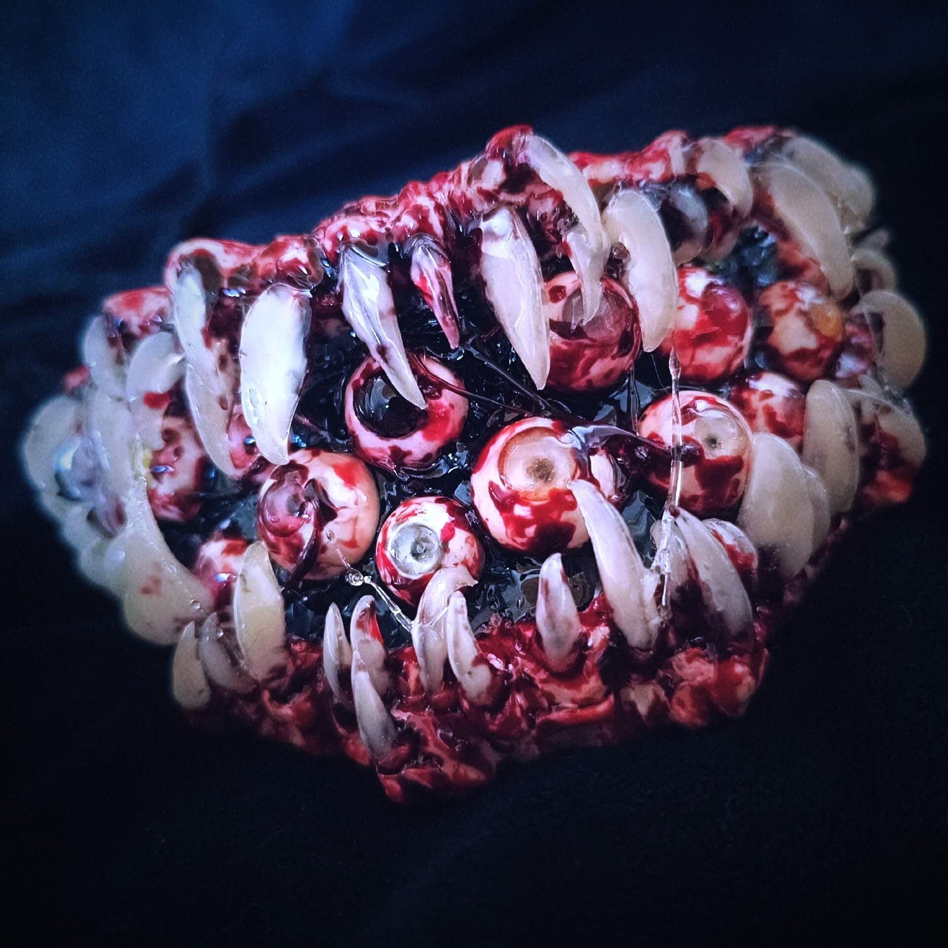 The BLOODSUNK MASK & CHOKER is handcrafted from eco-friendly resin and soft polymer clay, featuring a chilling, blood-soaked mouth with sharp teeth clenching a cluster of bloodied eyeballs. This striking design creates an eerie, yet captivating accessory for those who dare to make a bold statement.