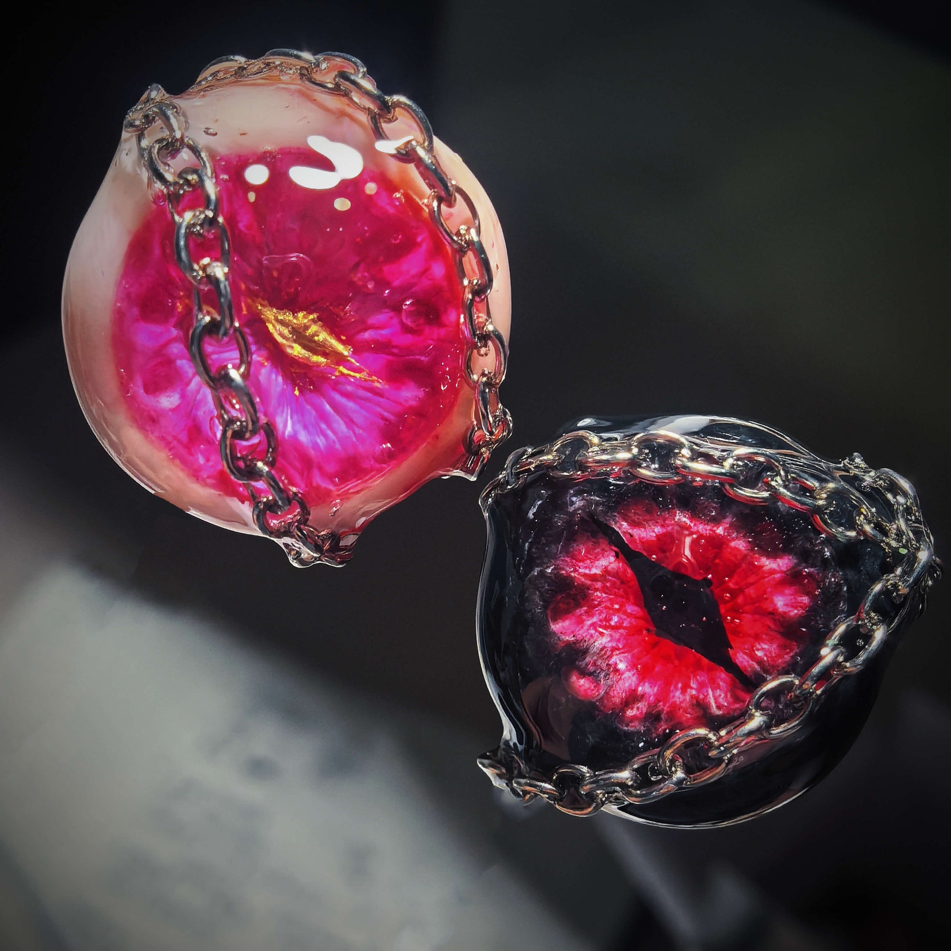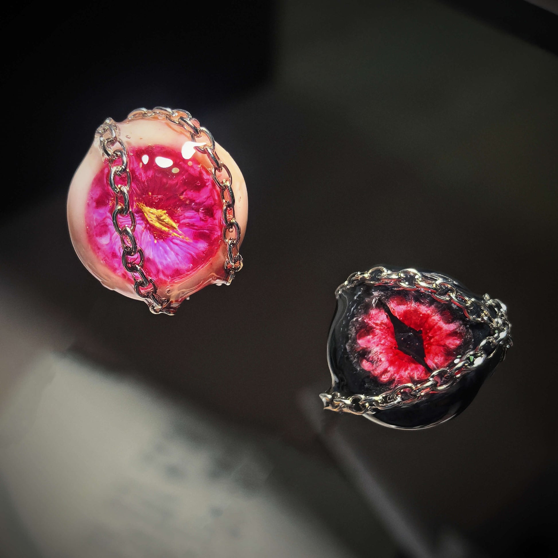 Pendant Details: Each eye pendant measures approximately 2 cm in diameter, featuring a romantic pink and enigmatic black design.