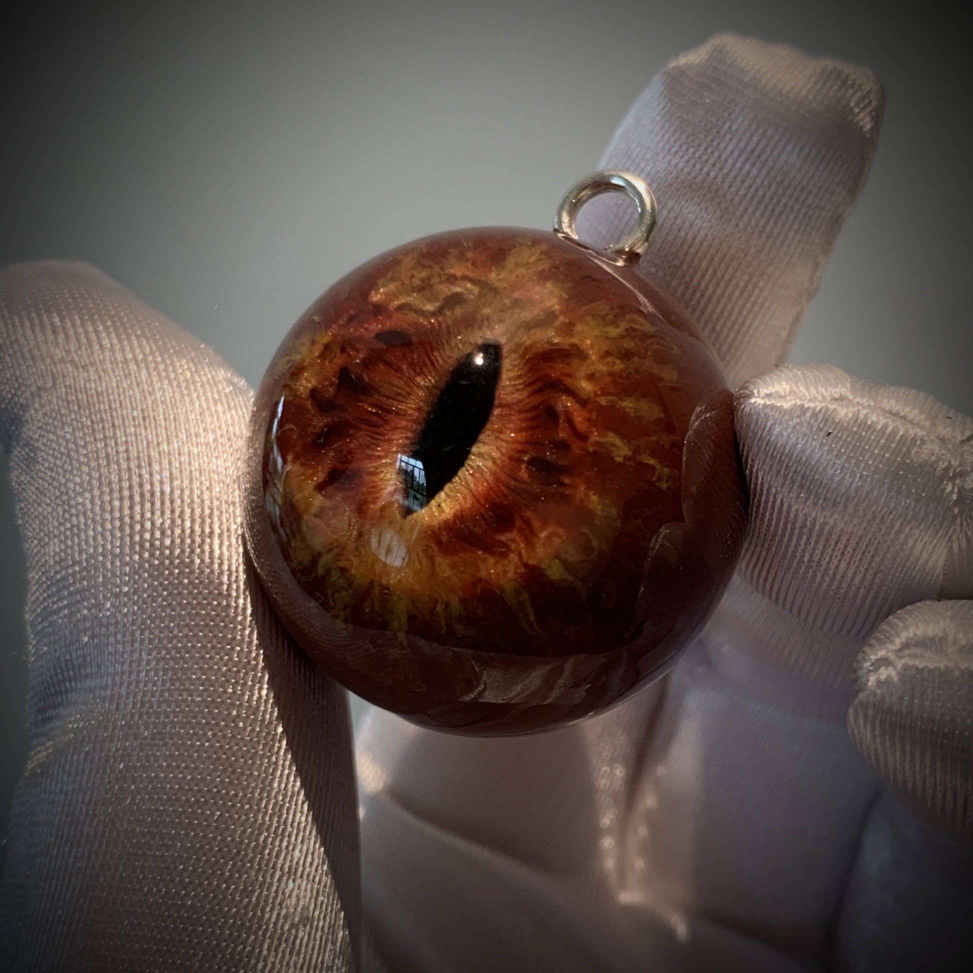 The eye's vivid red and yellow iris, with irregular flame-like patterns, is set against a deep brown-red sclera. The unique vertical slit pupil adds to its intense, fiery appearance. Made from eco-friendly resin and soft polymer clay, the pendant is durable, hypoallergenic, and resistant to yellowing.