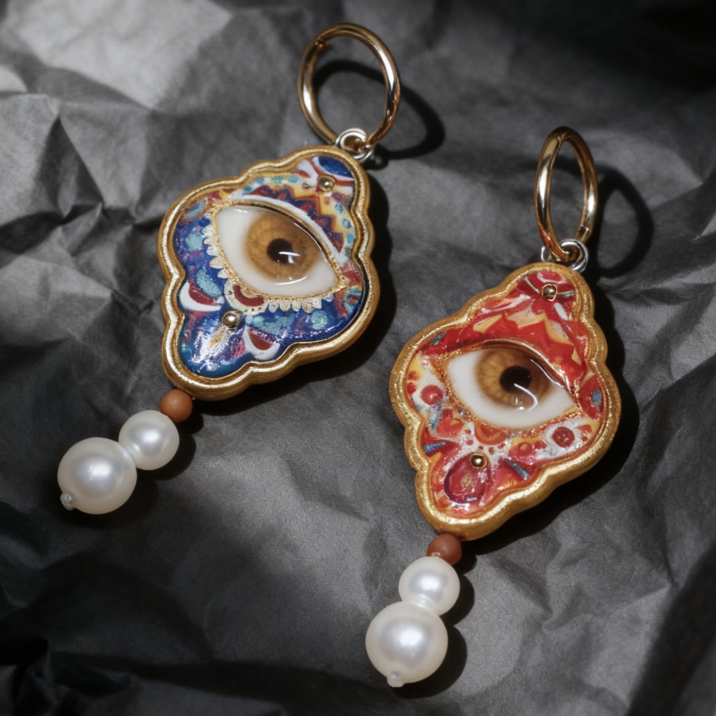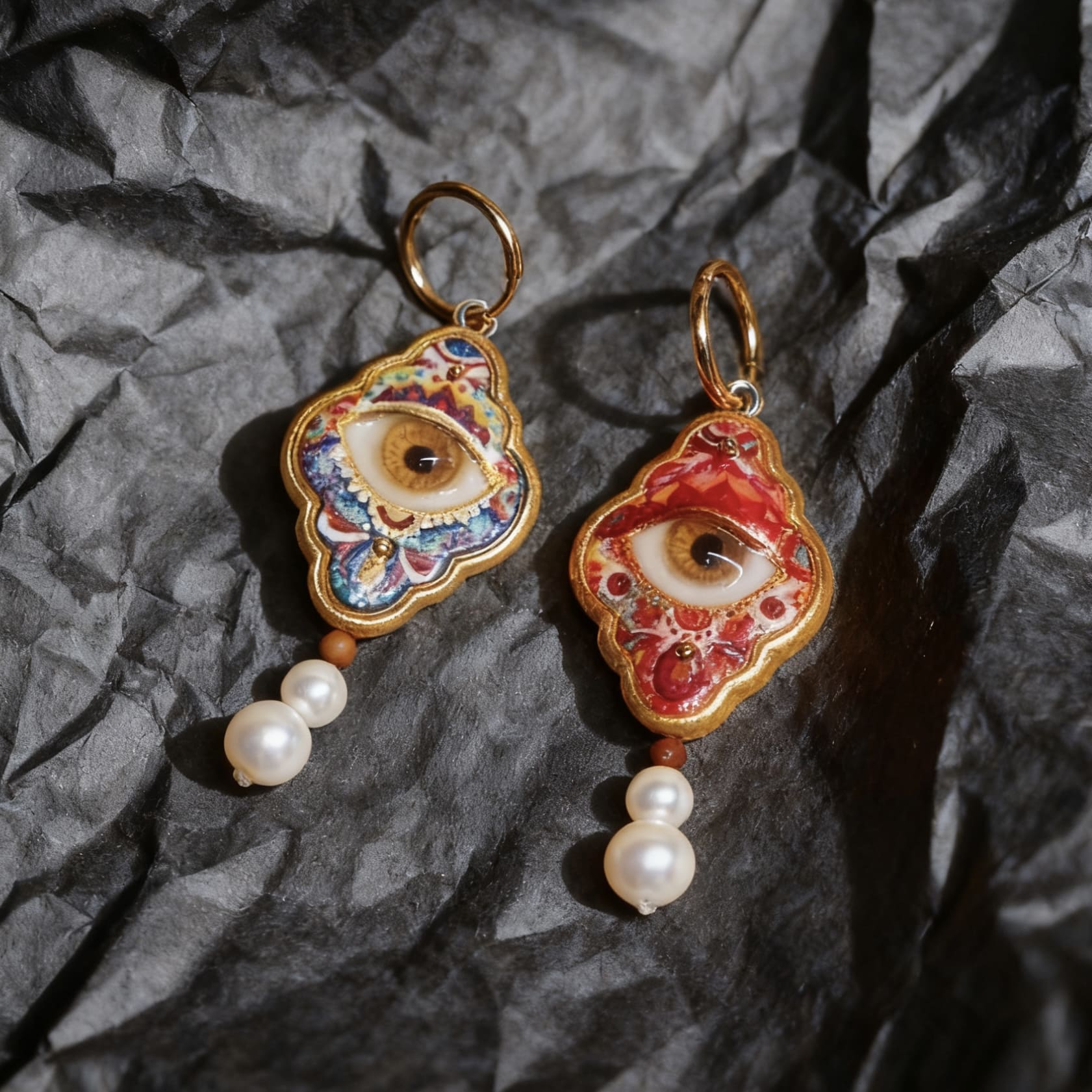 This pair of handmade earrings features intricately hand-painted pendants, each embedded with a lifelike eye at the center. The eye color and the surrounding painted pattern are fully customizable, allowing for a truly personal piece. The pendants are bordered with 18K gold-infused paint, highlighting the vibrant motifs inspired by ancient totems symbolizing health, happiness, and protection. At the base of each pendant, multiple natural pearls dangle gracefully, adding an elegant and mystical charm.