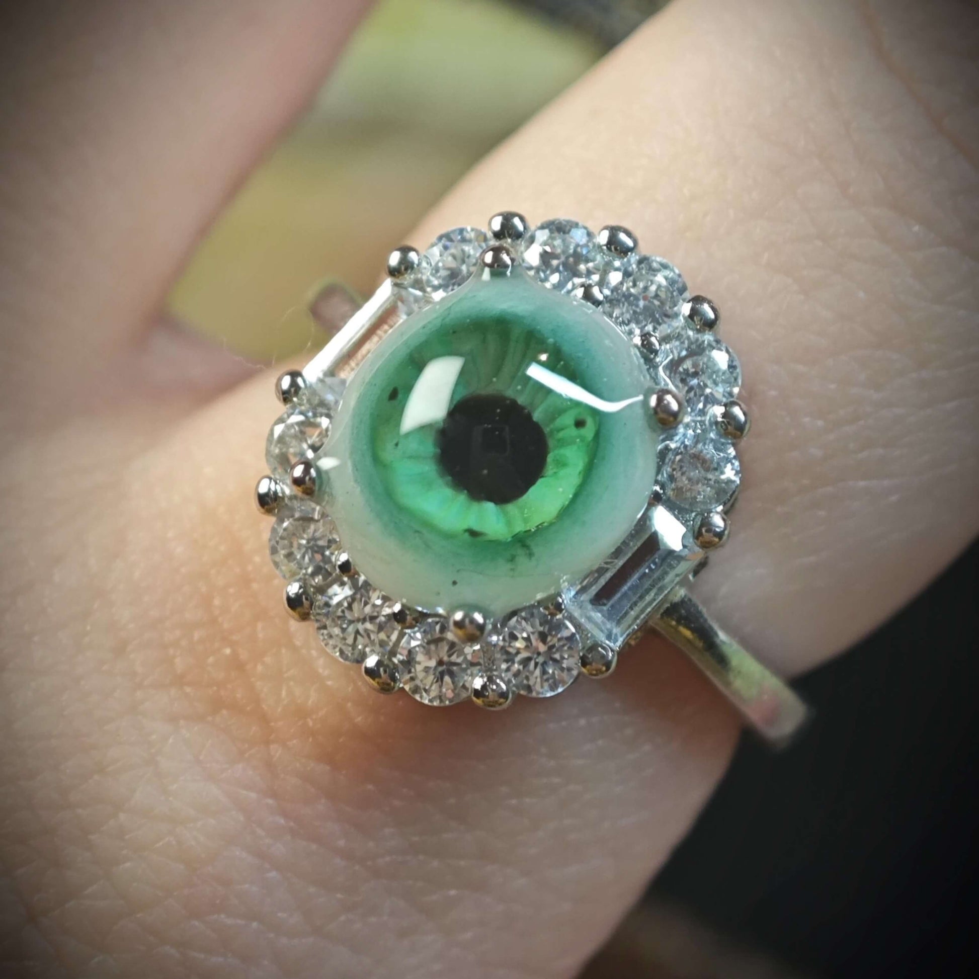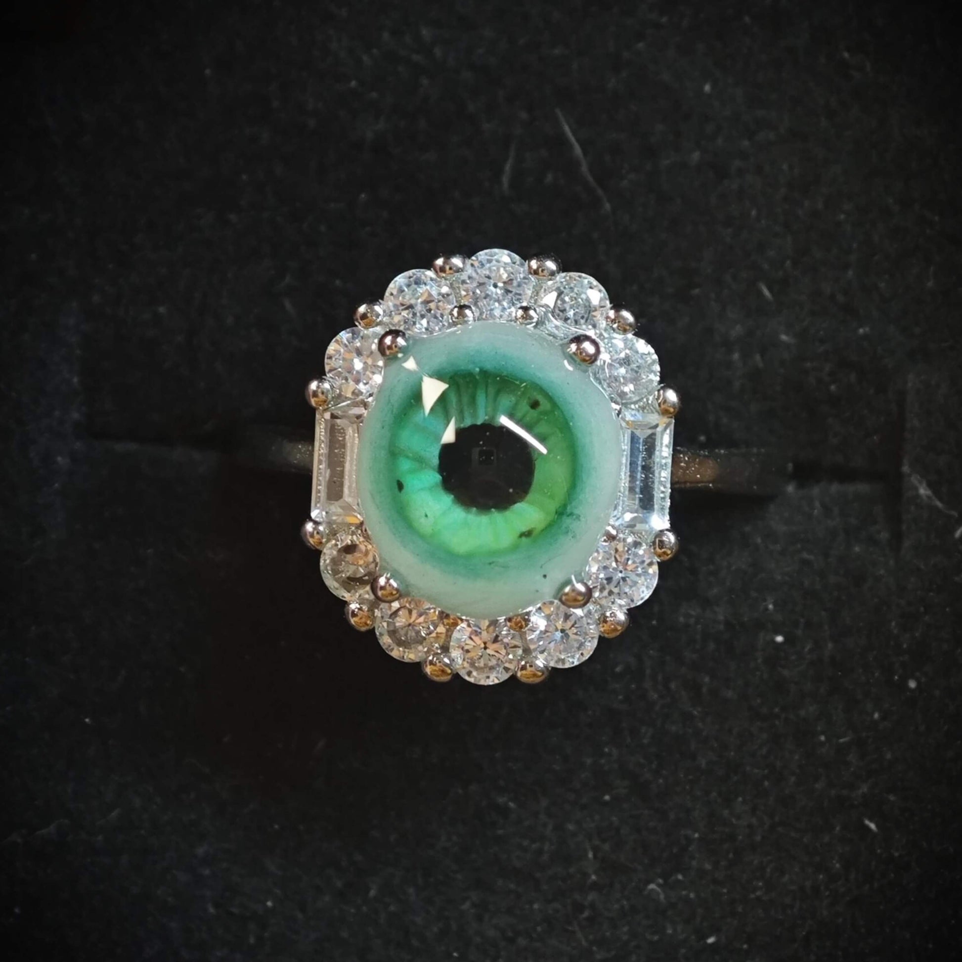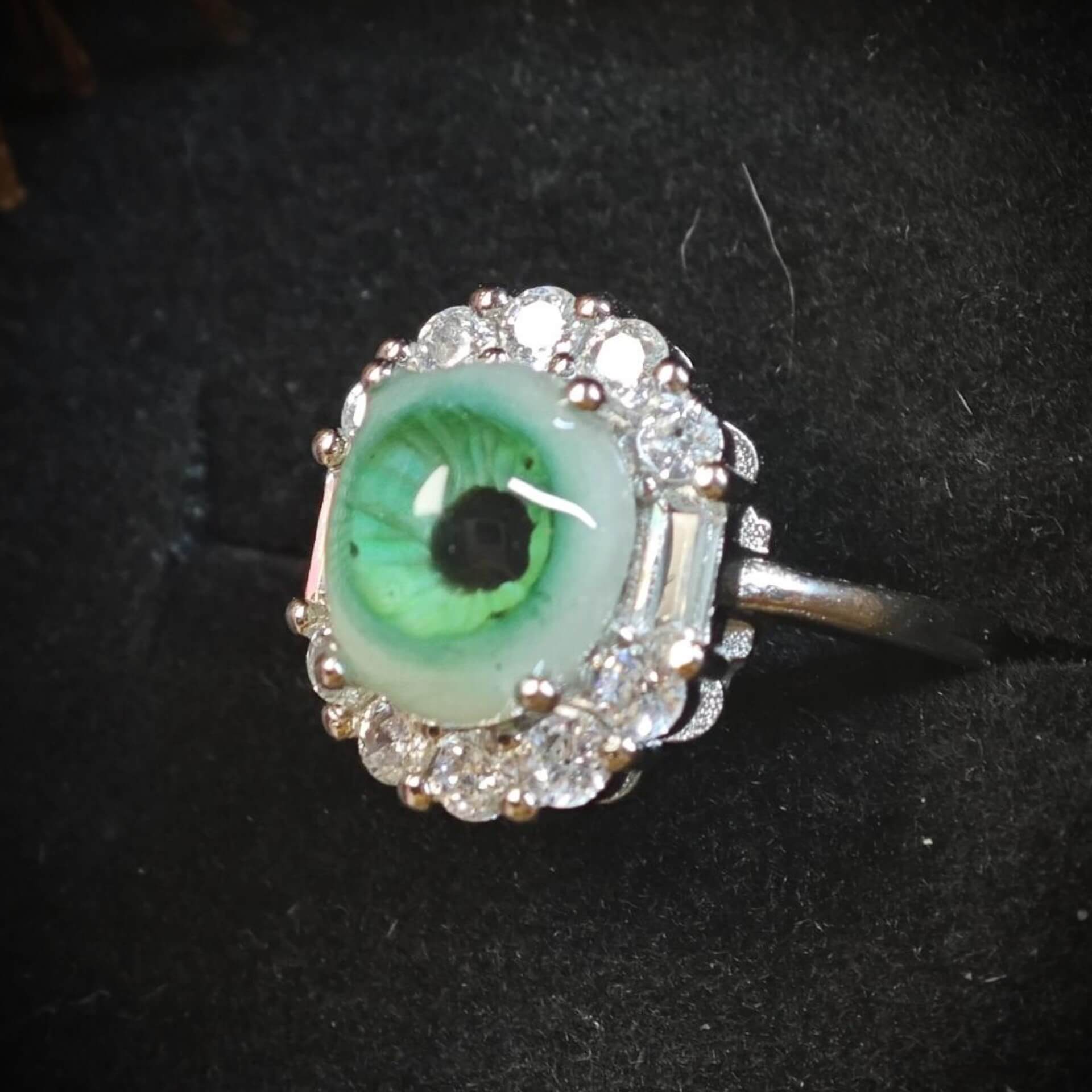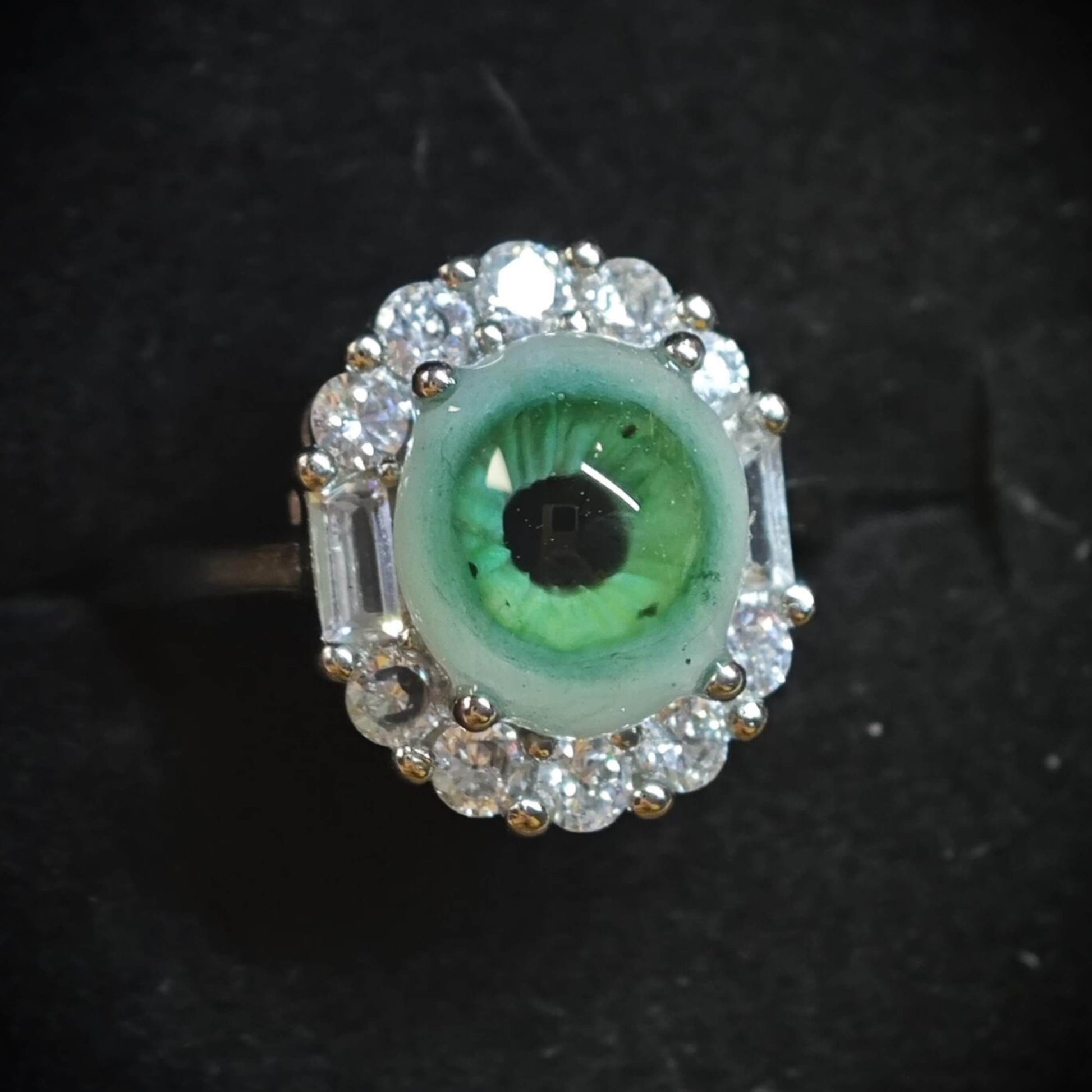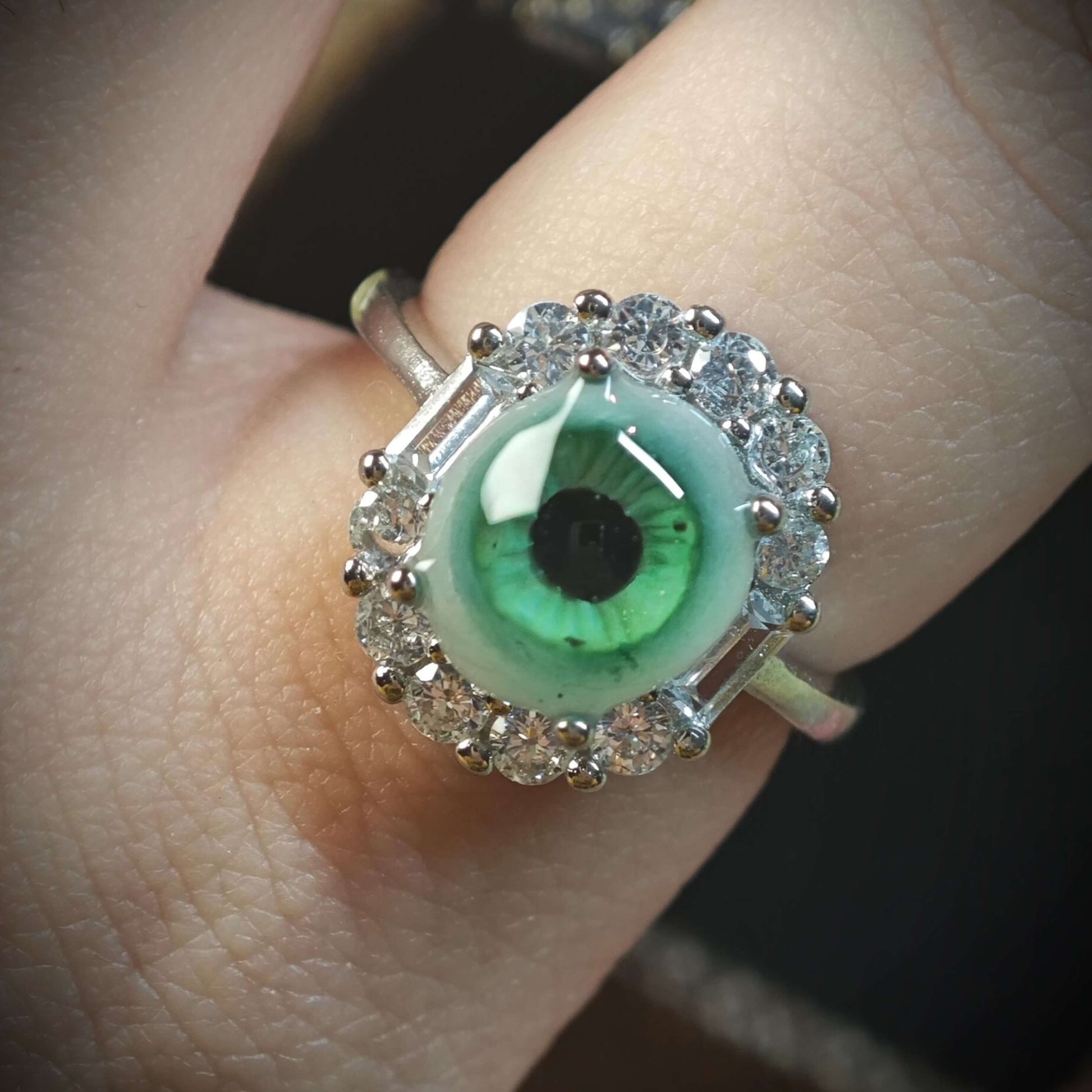 The JADE HORIZON is a stunning handcrafted piece, featuring a mesmerizing eyeball design with a vivid green iris and a bold black pupil. The eyeball is elegantly framed by an oval border of sparkling diamonds, creating a luxurious and eye-catching aesthetic. Crafted from eco-friendly resin and soft polymer clay, the eyeball is waterproof, fade-proof, and hypoallergenic. The ring band is made from 925 sterling silver, ensuring durability and comfort for sensitive skin.