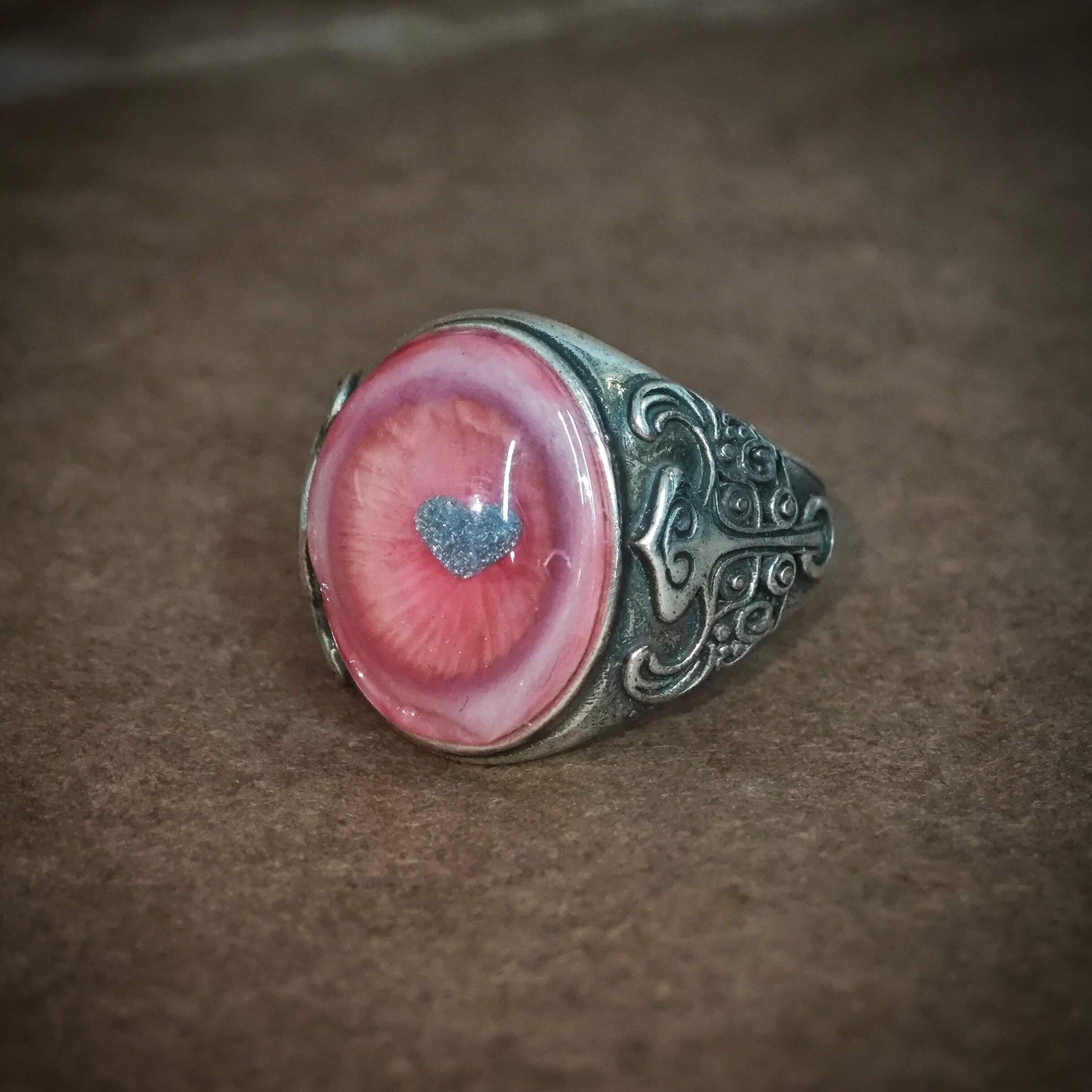 A dreamy pink oval eye with a sparkling silver heart-shaped pupil and soft pink iris—sweet, strange, and impossible to ignore.