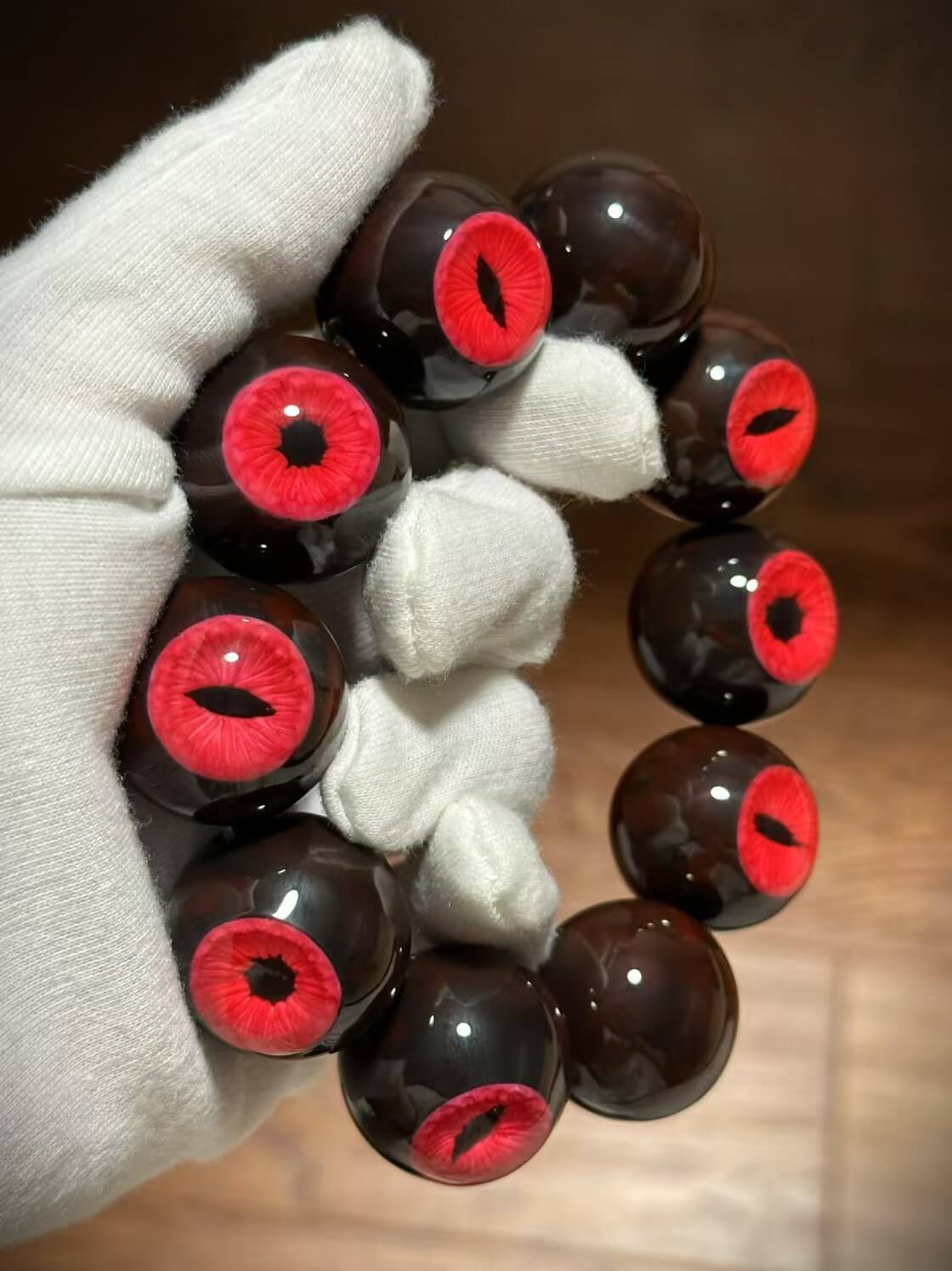 - Bead Details: 20 black beads with crimson irises, alternating between slit beast pupils and round pupils. Each bead features intricate blood vessel detailing.