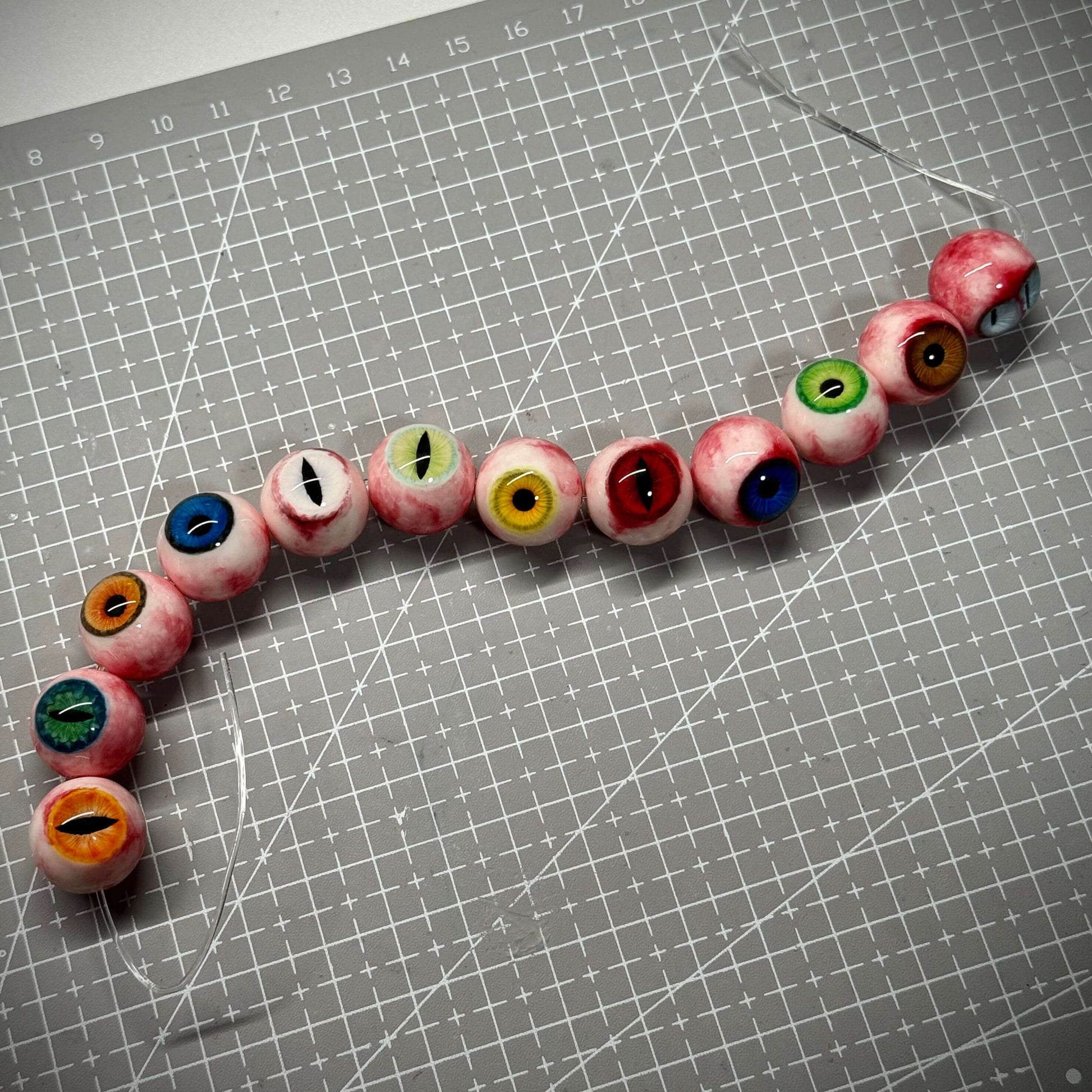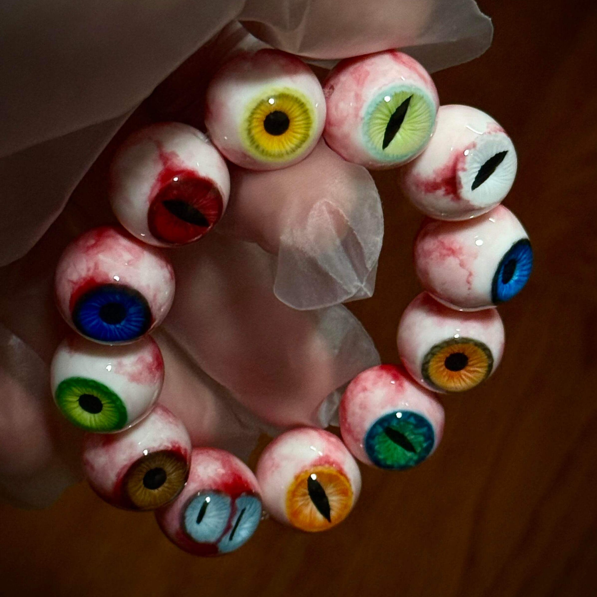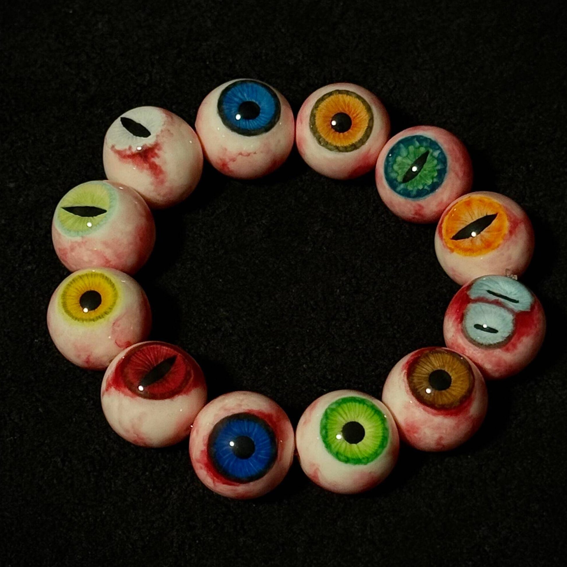 The bracelet showcases a collection of uniquely designed eyes—green irises, golden beast pupils, deep moss-green slits, blood-red feral eyes, and sky-blue gazes. Each bead is meticulously detailed to reflect surreal beauty and haunting realism.
