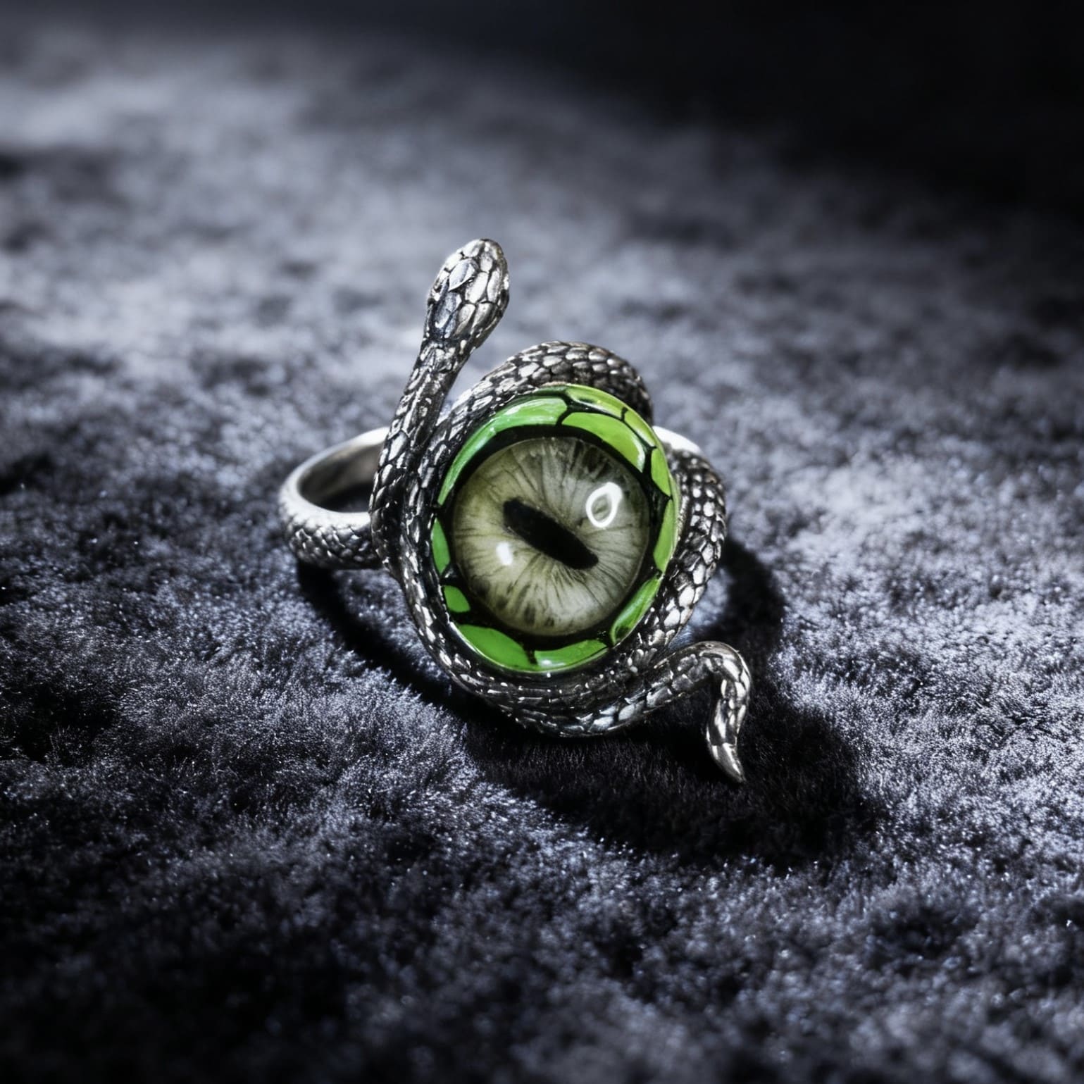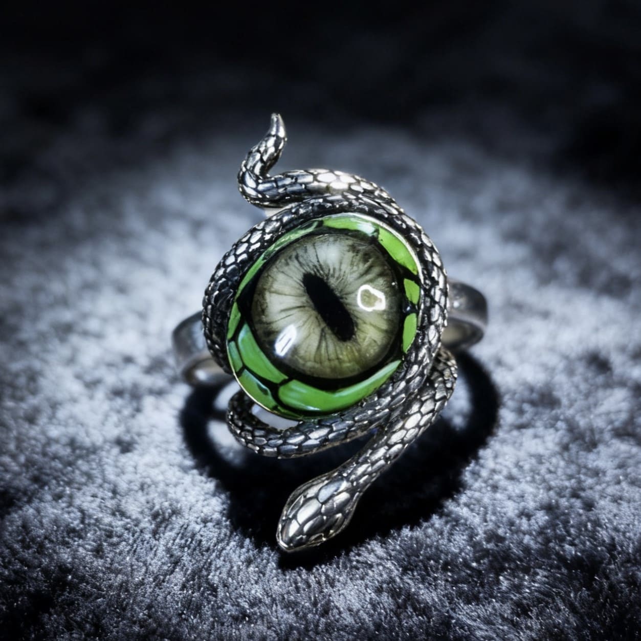 A handcrafted serpent-eye ring that captures the hypnotic allure of a creature both divine and venomous. Each piece features a lifelike eye sculpted from high-density polymer clay and eco-resin, set within a coiled titanium steel serpent — a symbol of rebirth, wisdom, and forbidden vision.