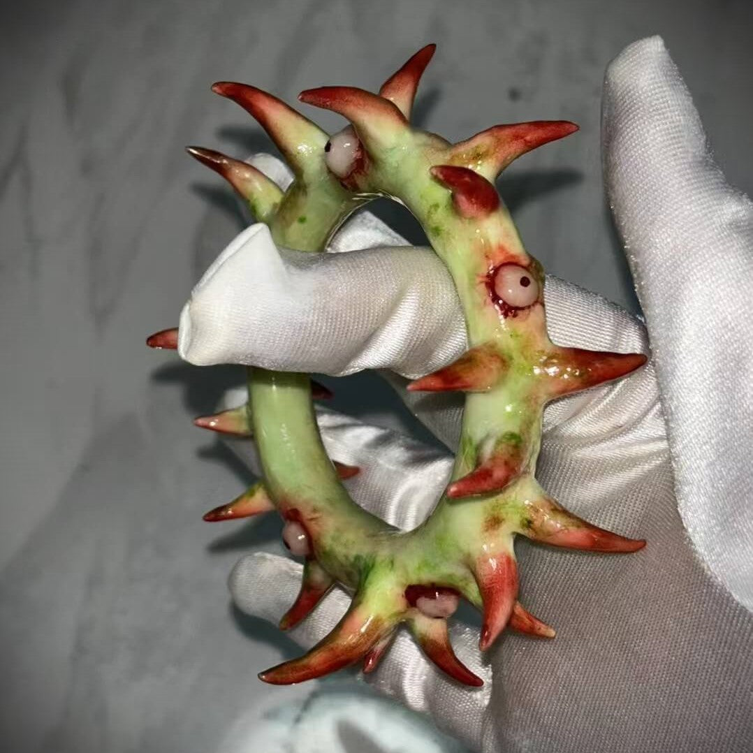 The PRAYING MANTIS bangle channels the elegance and fierceness of one of nature’s most captivating creatures. With its green base and blood-red spikes, it’s perfect for those who aren’t afraid to make a statement with their accessories. Bold, unique, and undeniably striking—wear it with pride.