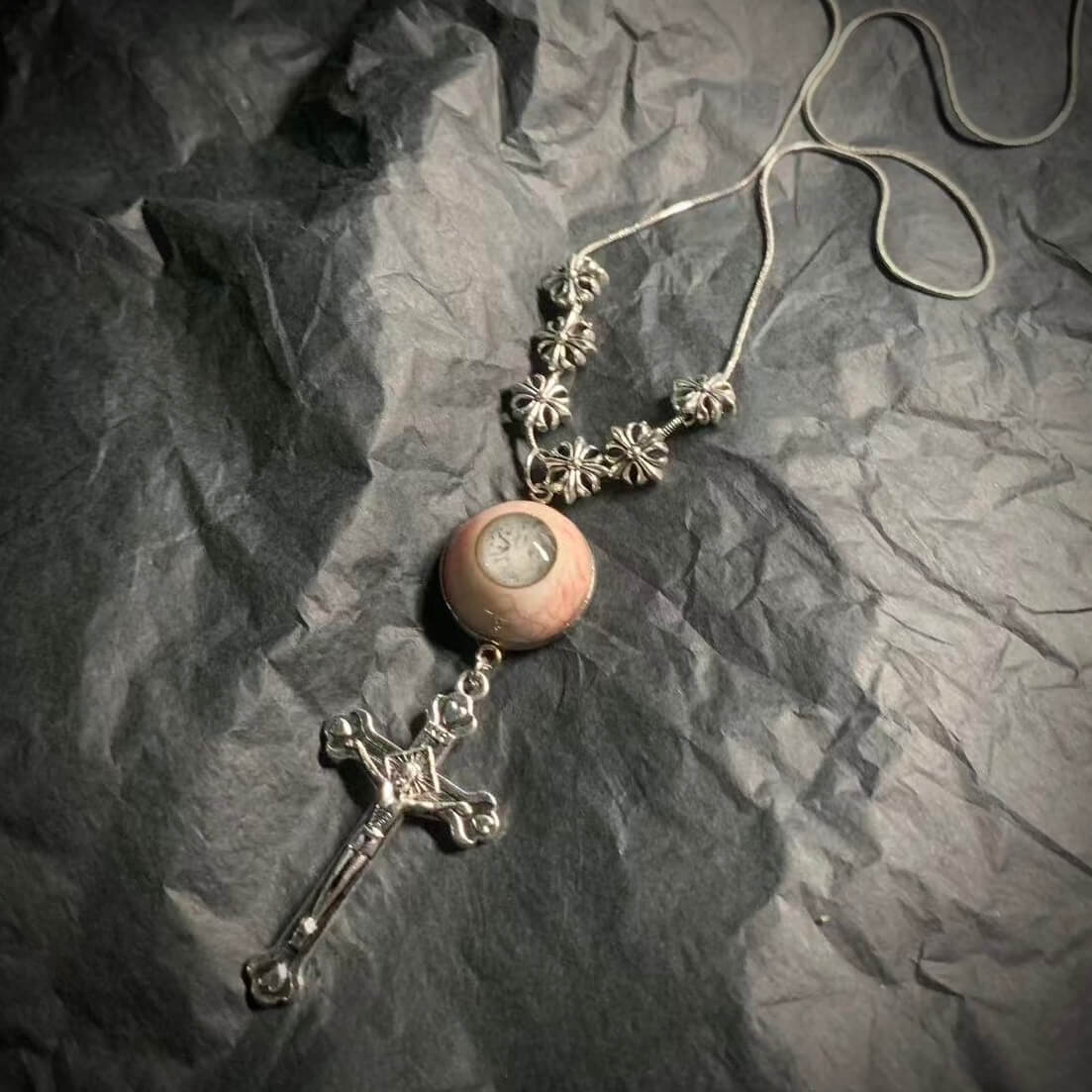 Pendant Details: The eyeball features a white iris with intricate blood vessel detailing, paired with a titanium steel Jesus cross pendant.