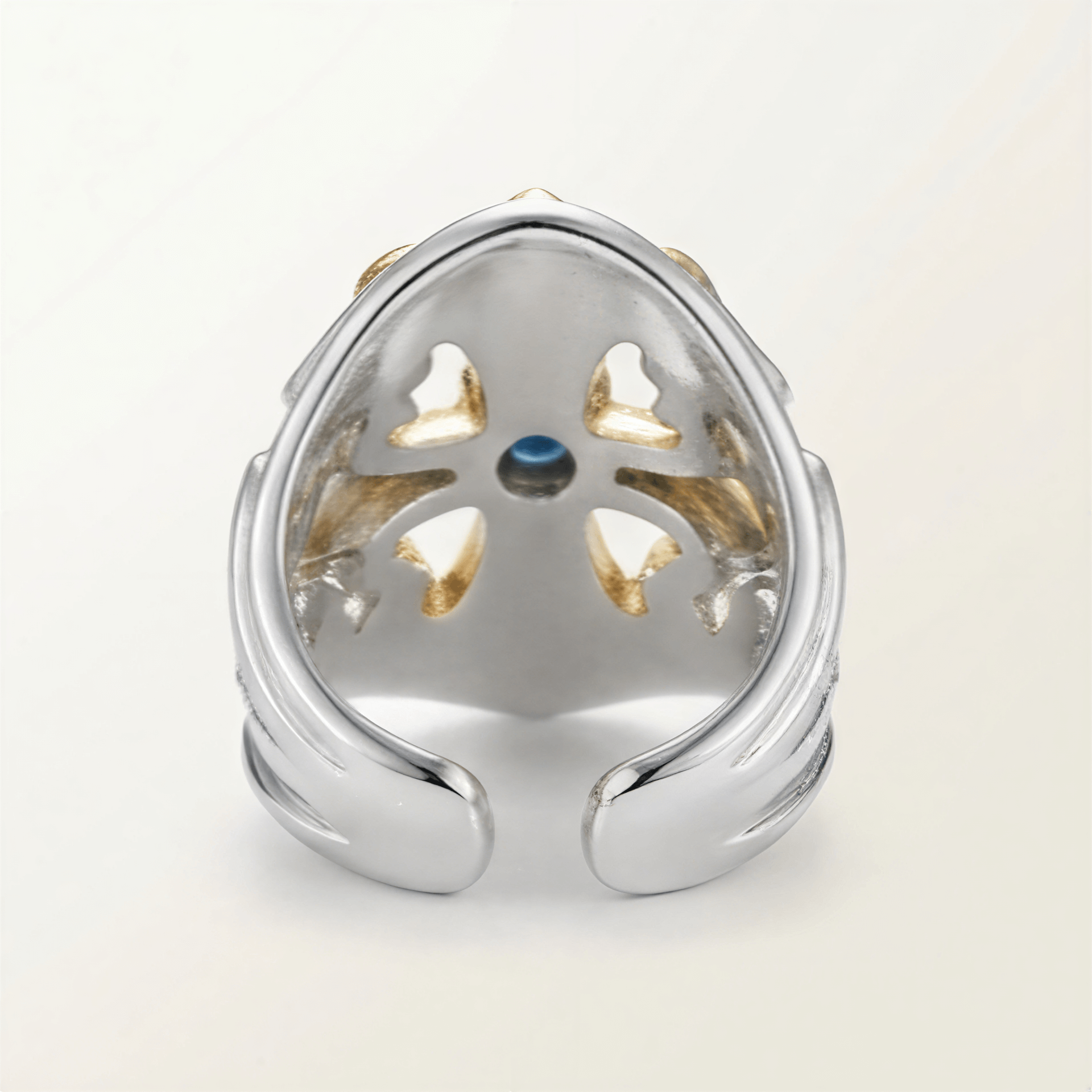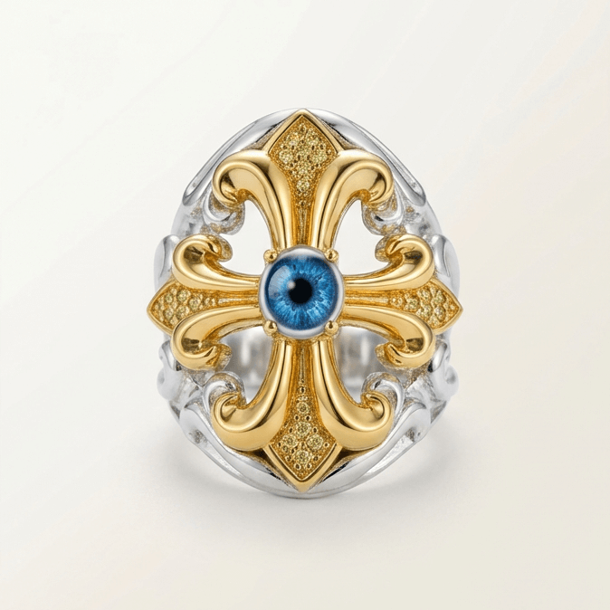 Inspired by the vaulted geometry of Gothic cathedrals. The intricate metallic lines weave together like a sacred miniature labyrinth, with the piercing blue eye at the center representing the truth found at its heart. I imagined this eye as the "soul" of an ancient structure—silently witnessing the passage of time, granting the wearer a sense of profound clarity and inner peace.