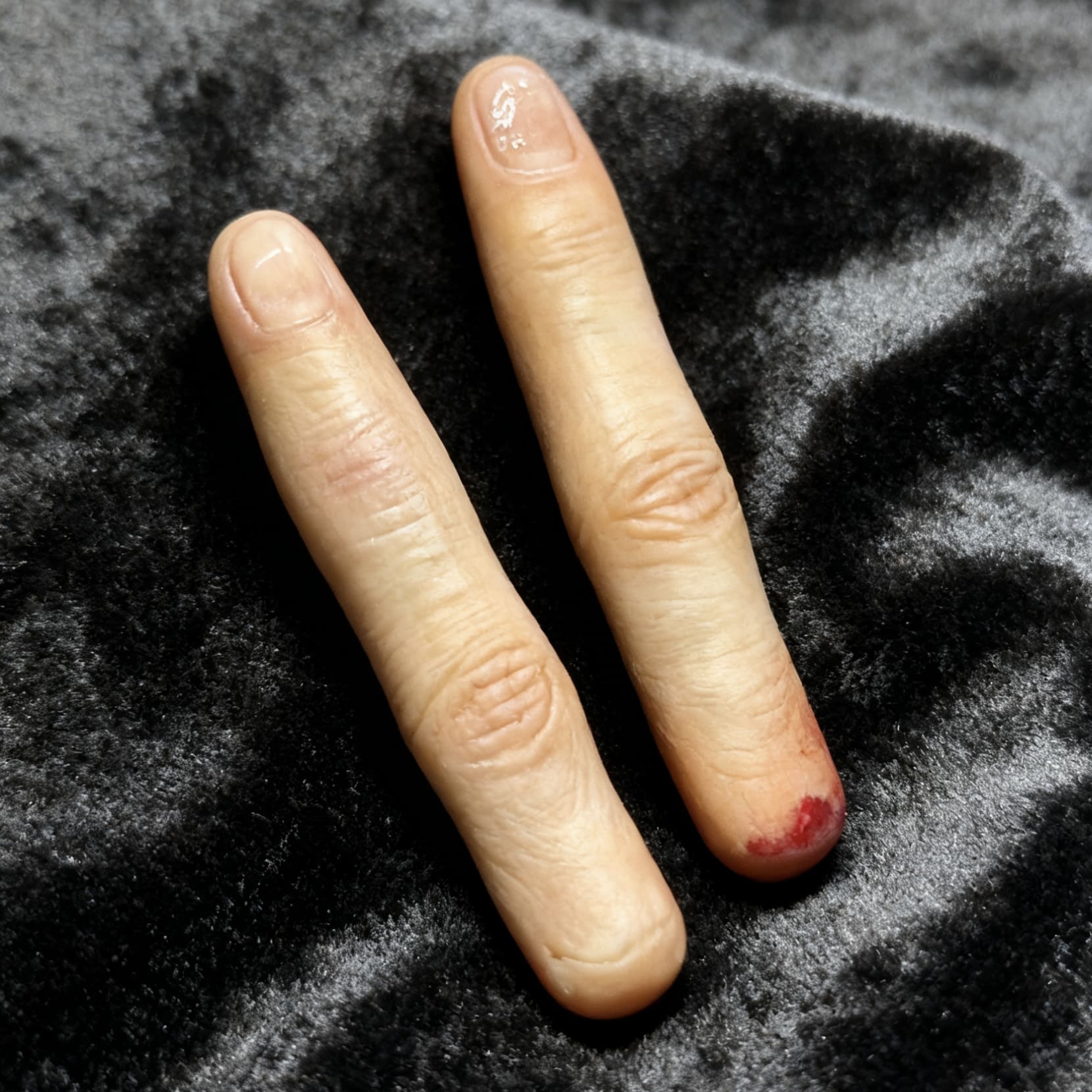 The finger is handcrafted from high-density clay and eco-friendly resin. Its surface is painted and finished with acrylic paints, pigments, and a clear protective coating. The hand-painted skin tone gradients and blood effects give it a highly realistic look and durability.