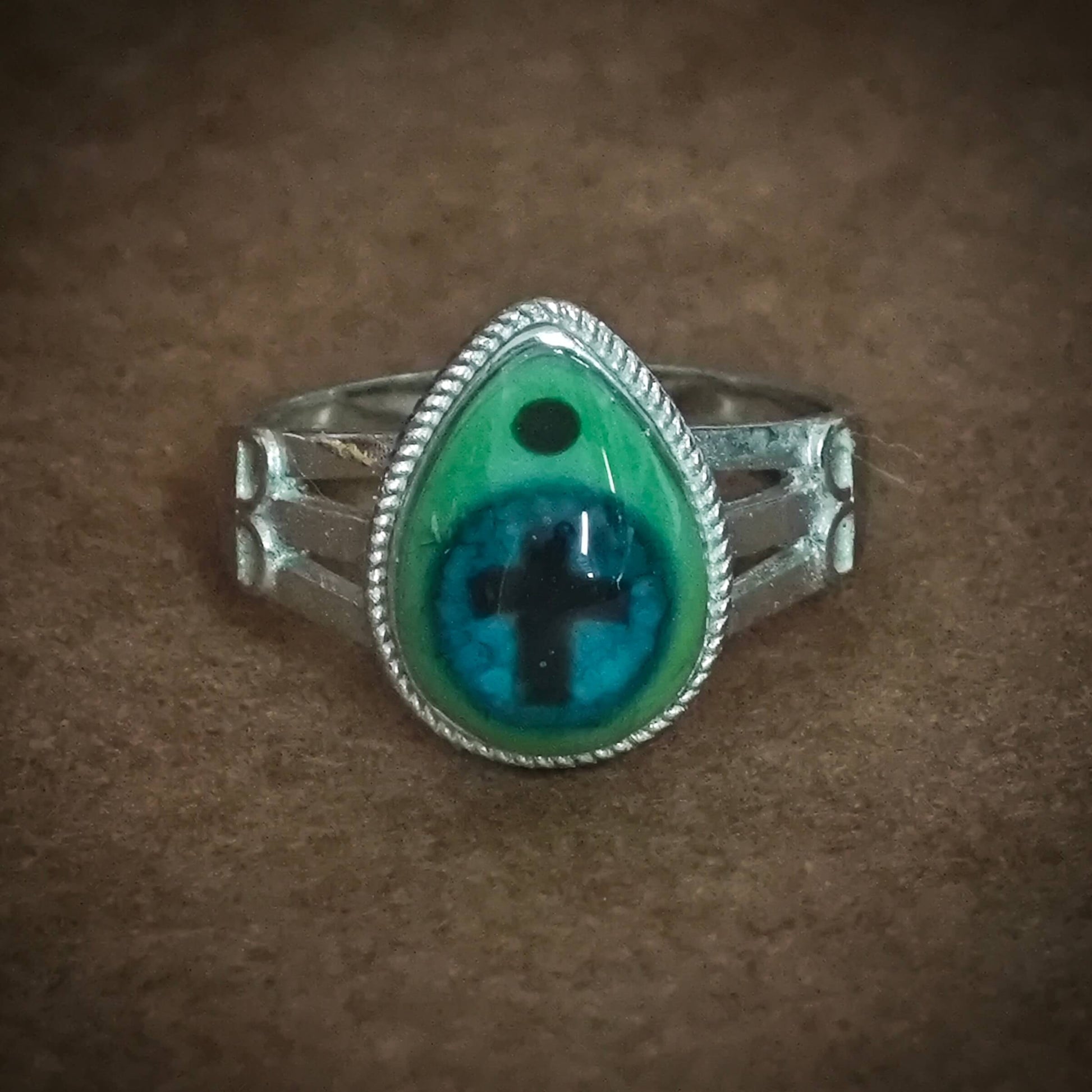 The TEAR OF TESTAMENT ring features a handcrafted resin eye set on a titanium steel adjustable band. Waterproof, hypoallergenic, and tarnish-resistant.