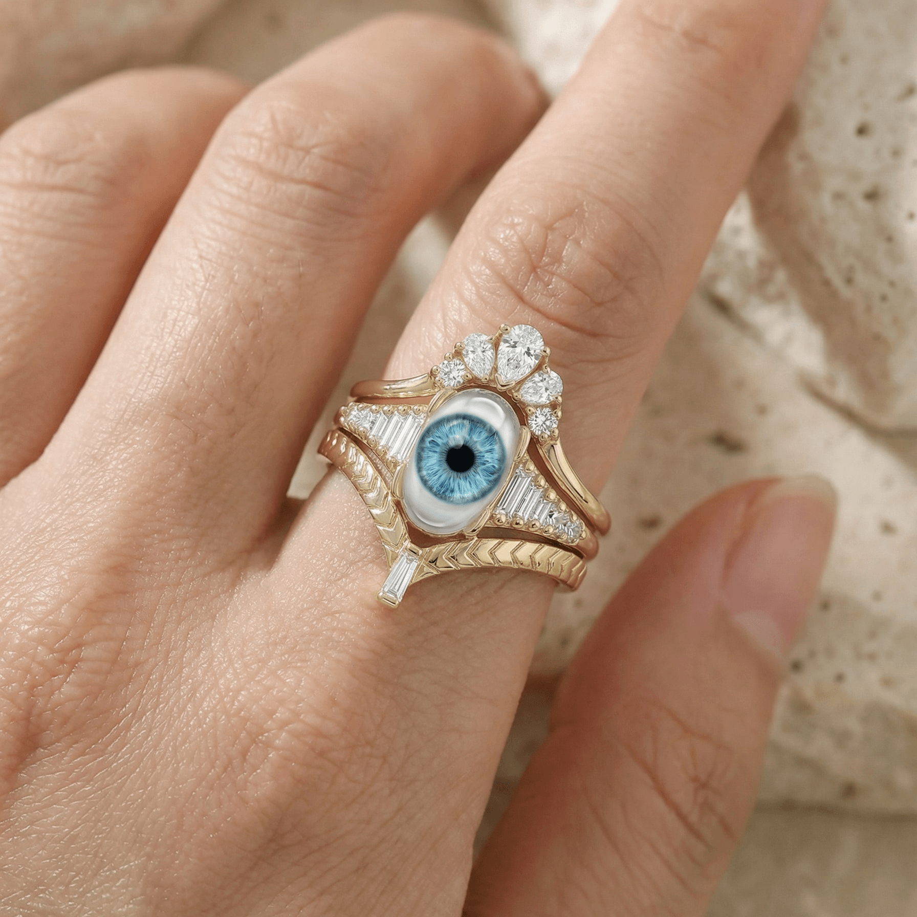 2. The Vision (Center): The centerpiece features a vertical, marquise-shaped "eye" flanked by sparkling baguette-cut crystals in a vintage sunburst setting.
