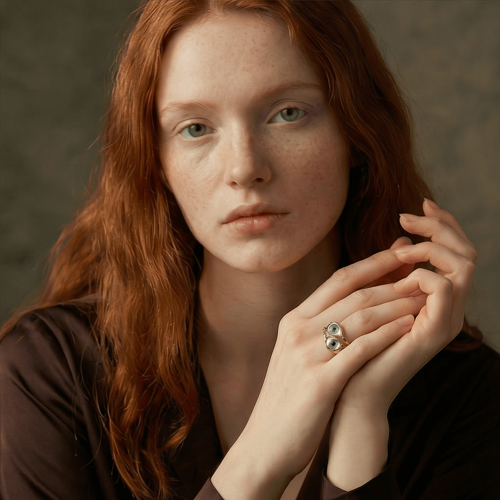 The Gaze: Teardrop-shaped irises (available in Moss Green and Azure Blue) encased in a protective crystal dome.