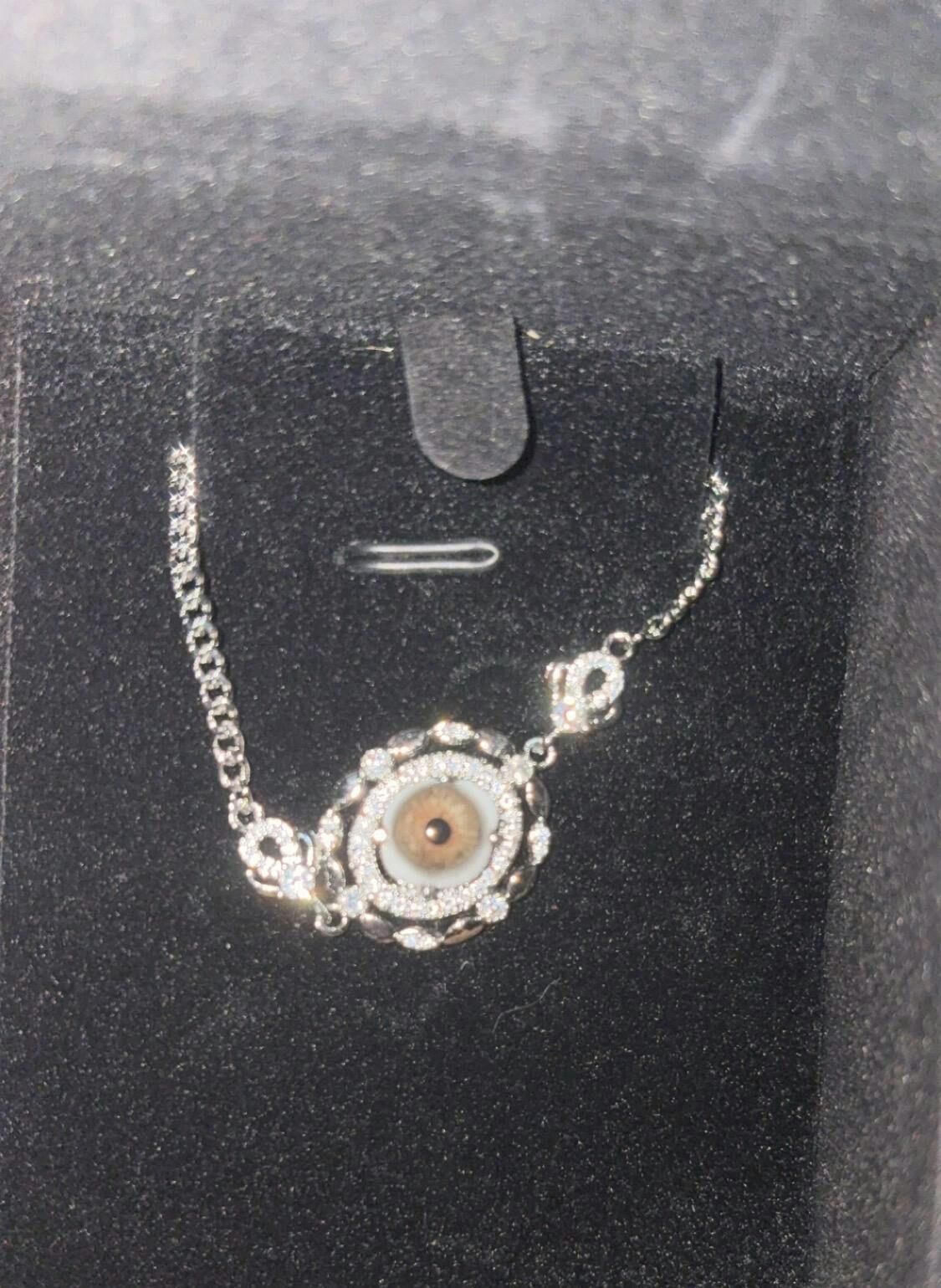 That’s when this bracelet was born: a hand-painted pale blue eye, set in a polished silver frame encrusted with sparkling cubic zirconia, linked to a delicate silver chain with floral filigree details. It’s a nod to that frozen lake — a piece of quiet, icy magic you can wear on your wrist.