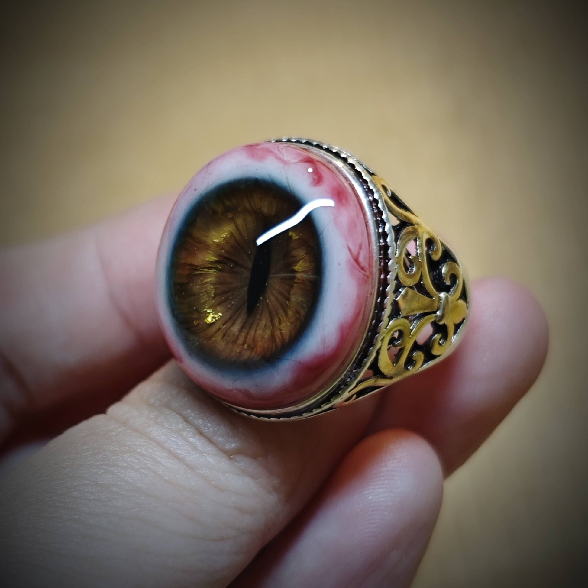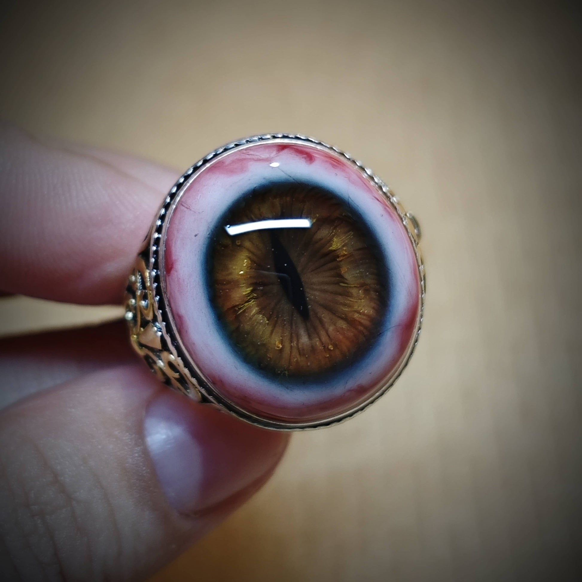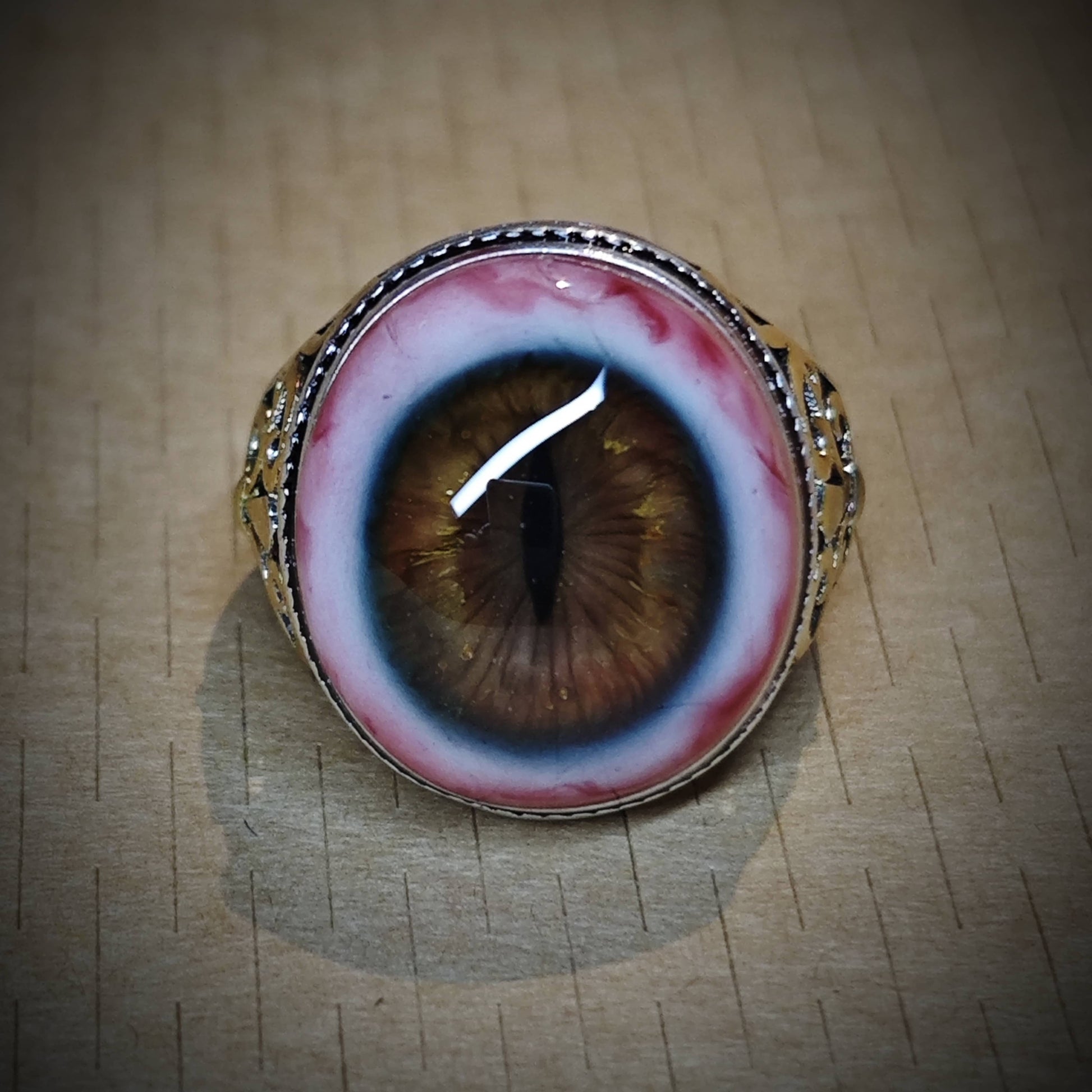 - Rich & Vivid Design: The eye features a stunning blend of deep browns, resembling the natural beauty of tiger's eye stone. The iris is accented with a shimmering gold dust, giving it a lustrous effect, while the vertical slit pupil adds an enigmatic, animalistic touch. Realistic blood vessel detailing adds depth and lifelike quality.