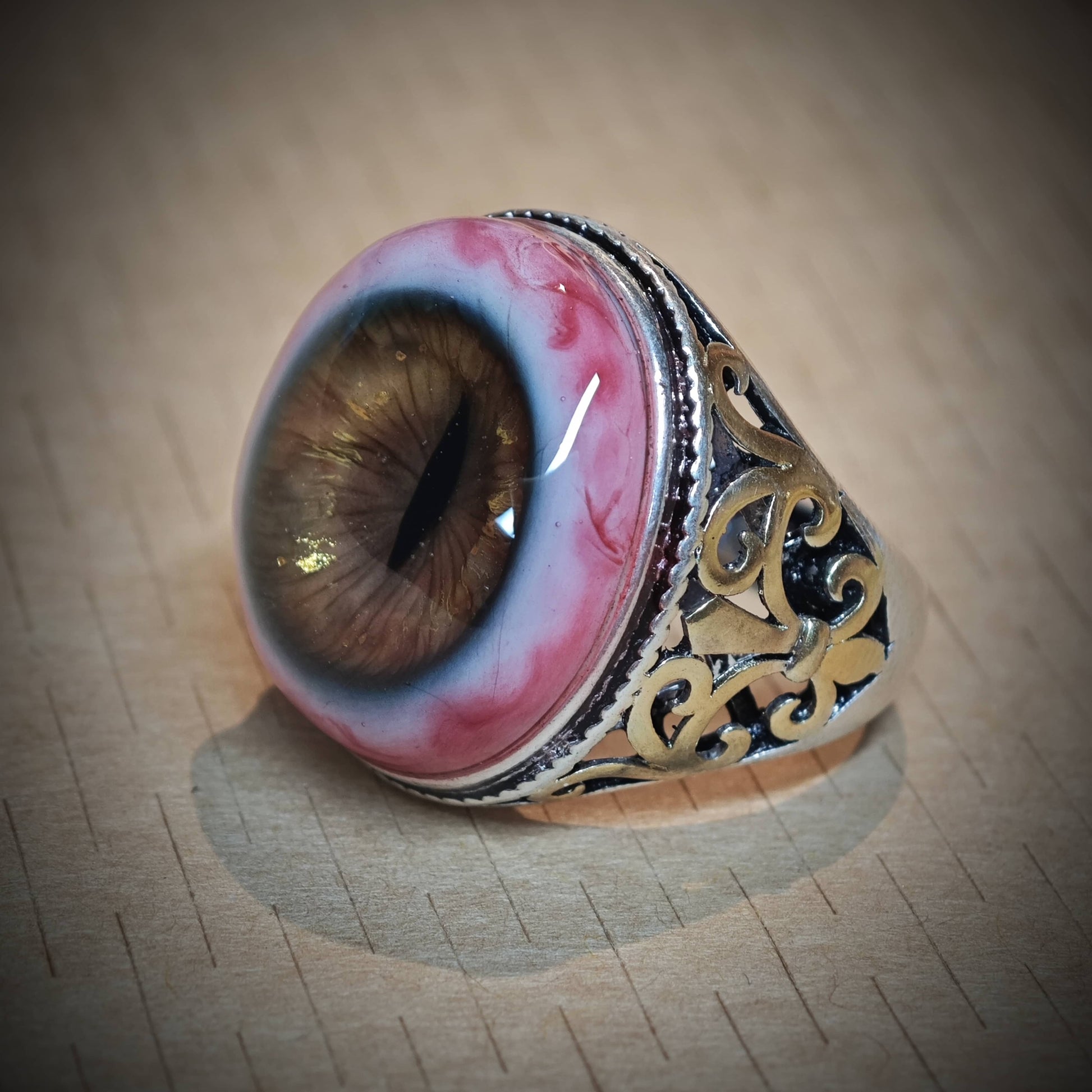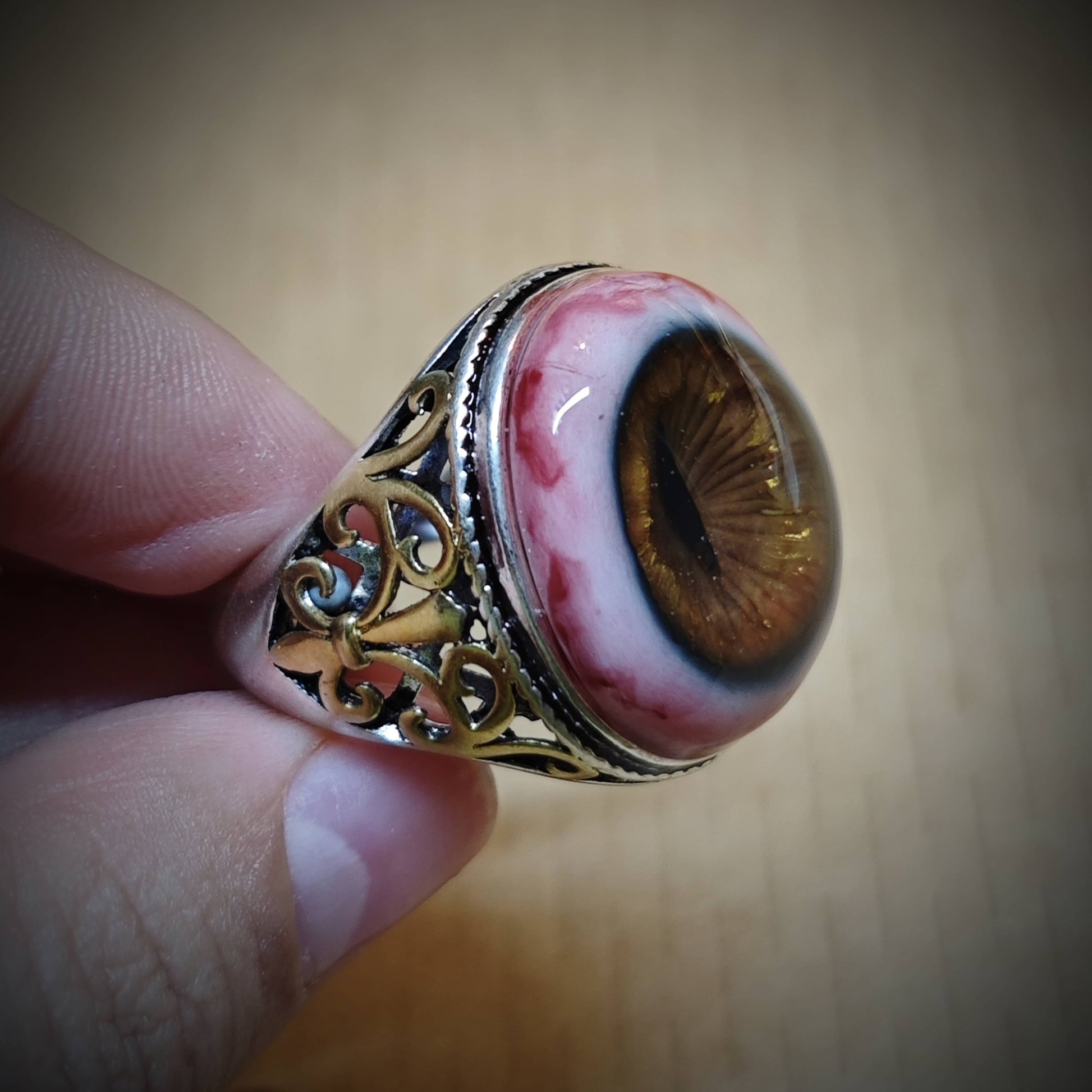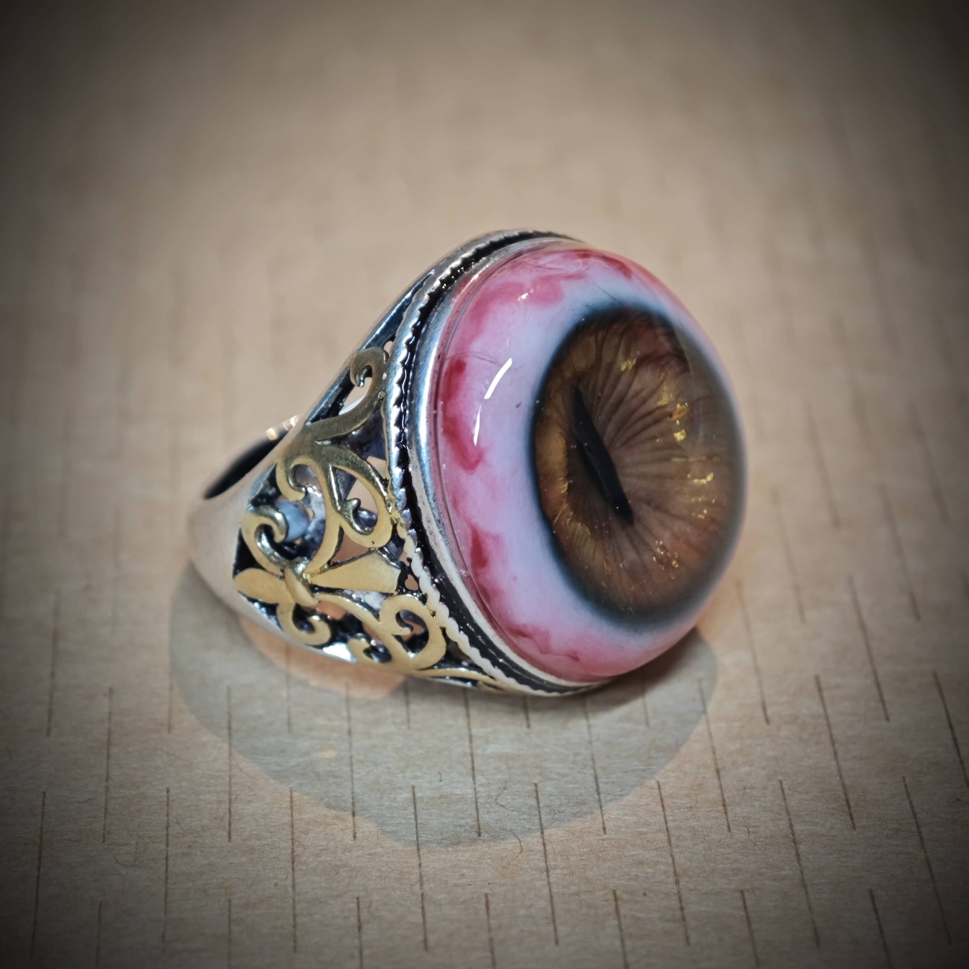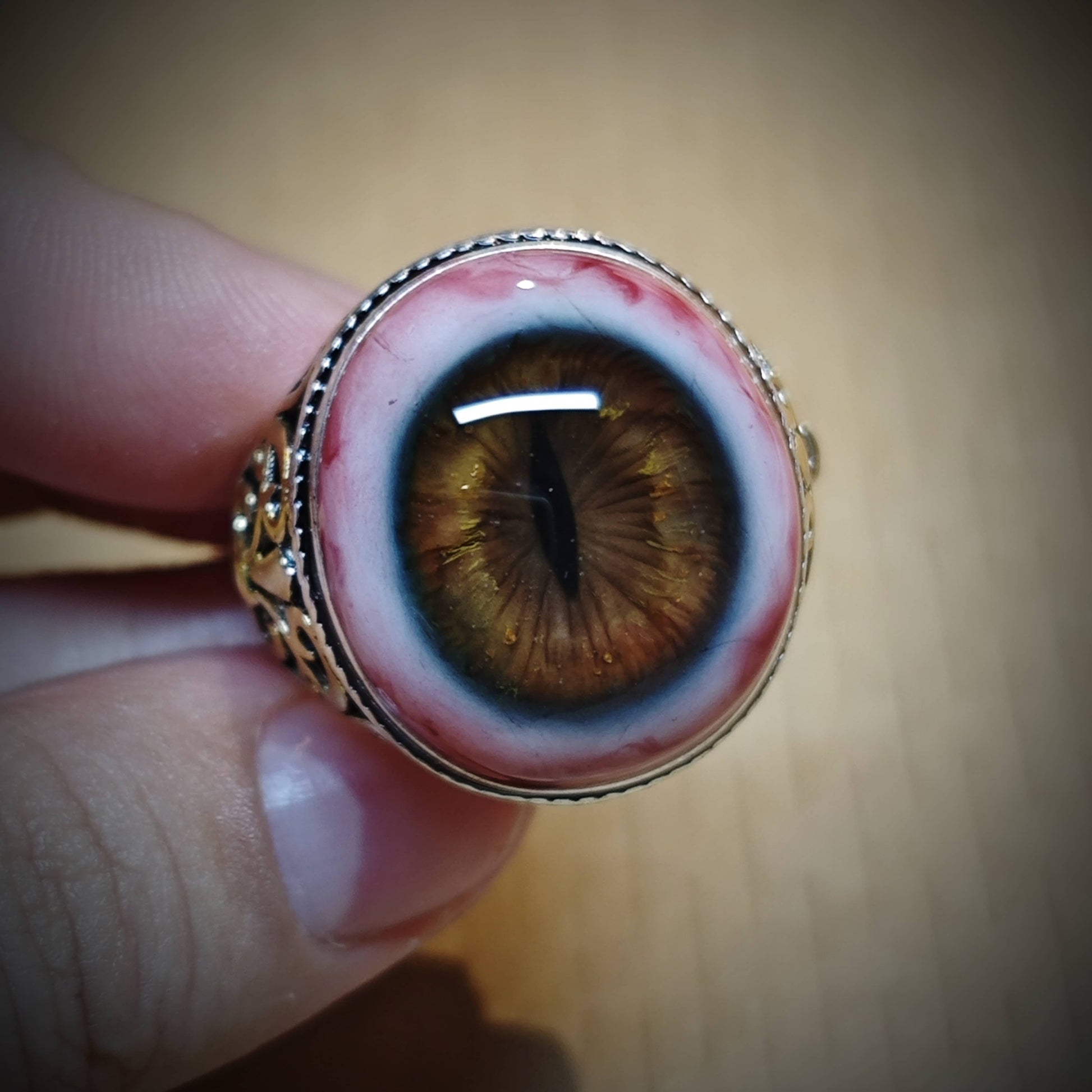 - Rich & Vivid Design: The eye features a stunning blend of deep browns, resembling the natural beauty of tiger's eye stone. The iris is accented with a shimmering gold dust, giving it a lustrous effect, while the vertical slit pupil adds an enigmatic, animalistic touch. Realistic blood vessel detailing adds depth and lifelike quality.