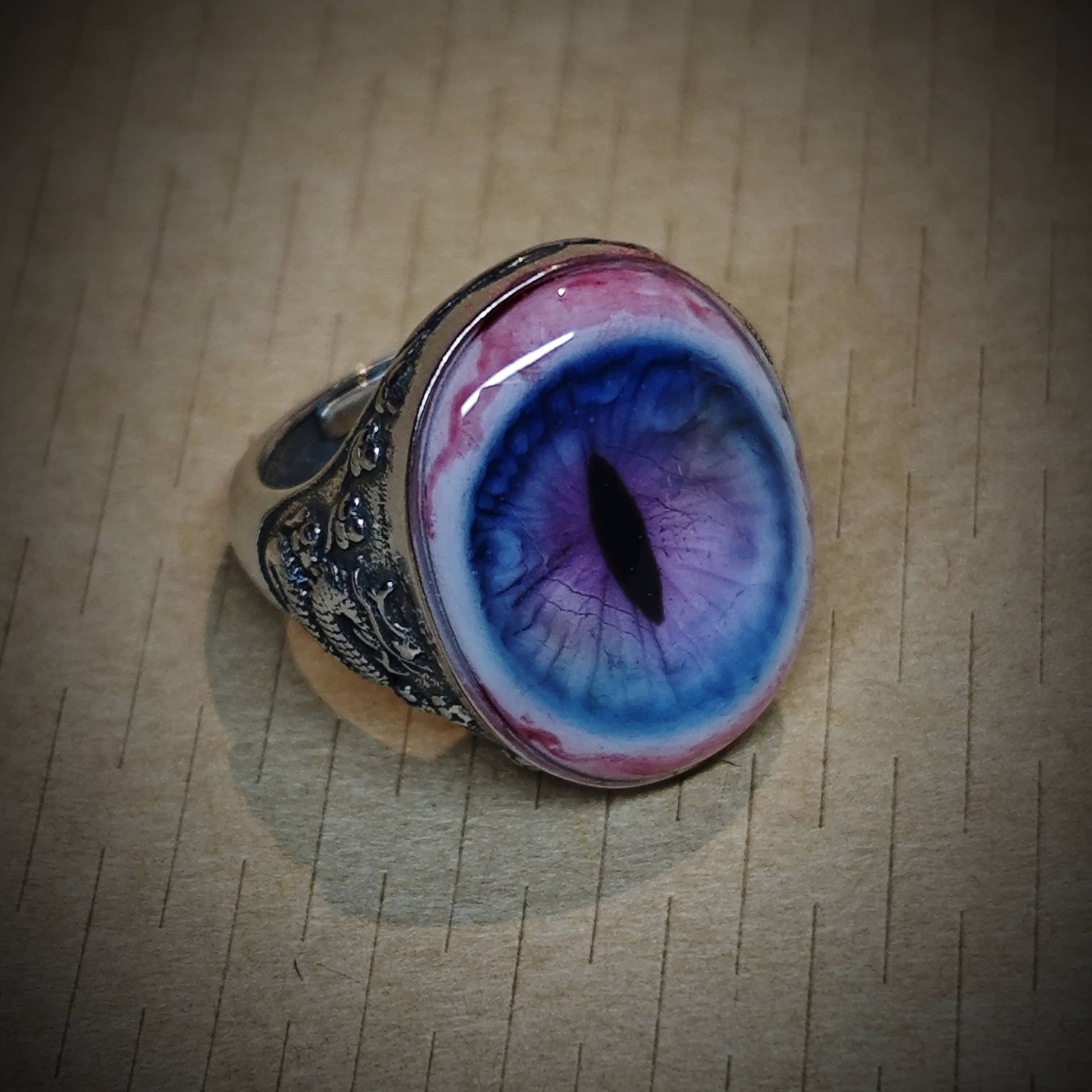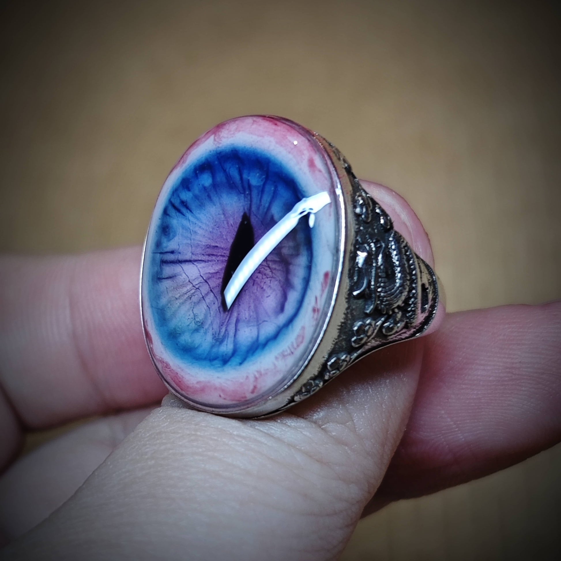 The TWILIGHT REVERIE ring is a dreamlike, handcrafted accessory that combines ethereal beauty with artisanal craftsmanship. The eye centerpiece is crafted from eco-friendly resin and soft polymer clay, while the band is made of 925 sterling silver. These materials are waterproof, non-yellowing, and hypoallergenic, ensuring both durability and comfort.